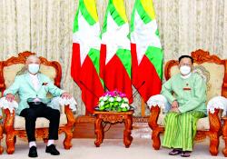 ပြည်ထောင်စုရွေးကောက်ပွဲကော်မရှင်ဥက္ကဋ္ဌ ဦးလှသိန်း ဂျပန်အစိုးရ၏ အထူးကိုယ်စားလှယ်၊ နိပွန်ဖောင်ဒေးရှင်းဥက္ကဋ္ဌနှင့် အထူးကိုယ်စားလှယ်အဖွဲ့အား လက်ခံတွေ့ဆုံ