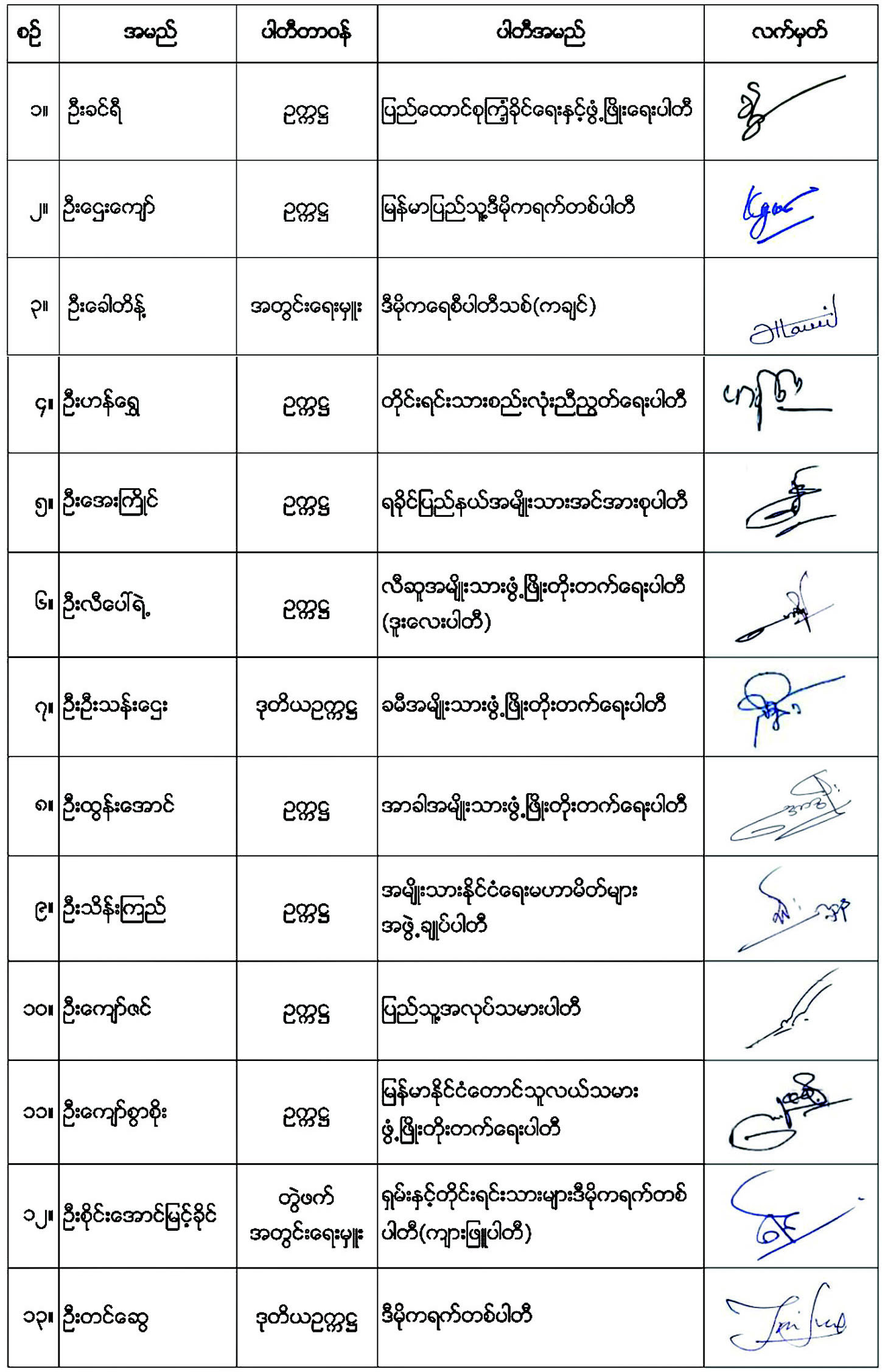 ၆။ သို့ဖြစ်ပါ၍ အကြမ်းဖက်လုပ်ရပ်များကို လုပ်ဆောင်လျက်ရှိသည့် MNDAA / TNLA / AA ၊ ယင်းတို့ နှင့် ဆက်စပ်ပတ်သက်နေသော အဖွဲ့အစည်းများနှင့် ယင်းတို့၏လုပ်ရပ်များကို ဆန့်ကျင်၊ ရှုတ်ချ၊ ကန့်ကွက် ပါကြောင်း ကျွန်ုပ်တို့နိုင်ငံရေးပါတီများက လက်မှတ်ရေးထိုး ပူးတွဲသဘောထား ထုတ်ပြန်ကြေညာ အပ်ပါသည်။