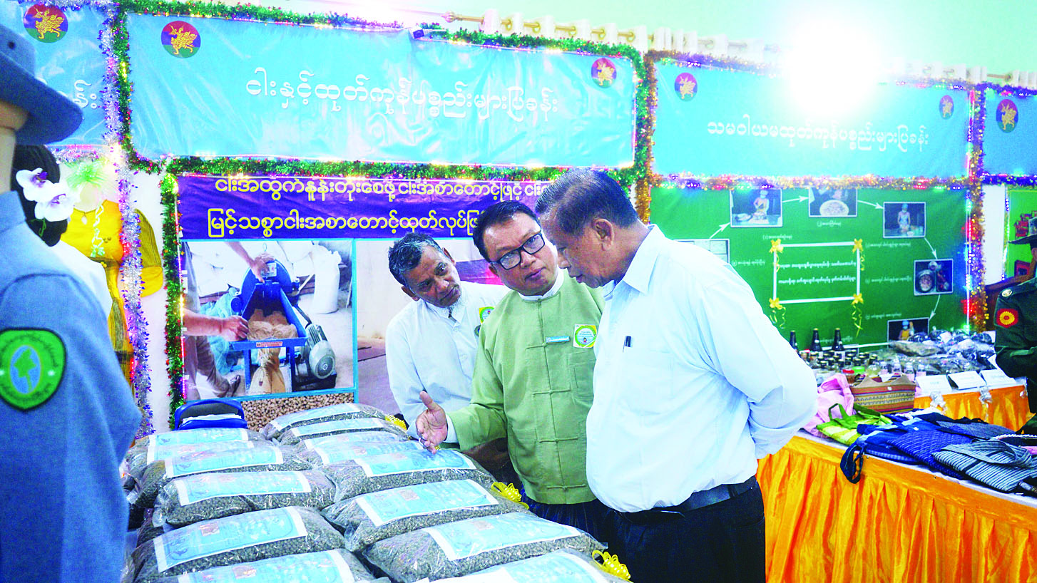 ထို့နောက် နိုင်ငံတော်စီမံအုပ်ချုပ်ရေး ကောင်စီအဖွဲ့ဝင် ပြည်နယ်ဝန်ကြီးချုပ်နှင့် တာဝန်ရှိသူများသည် ဌာနဆိုင်ရာများနှင့် လုပ်ငန်းရှင်များပူးပေါင်း၍ ကဏ္ဍအလိုက် ဒေသထုတ်ကုန်ပစ္စည်းများ ခင်းကျင်းပြသ ထားသော အသေးစား၊ အငယ်စားနှင့် အလတ်စား ထုတ်ကုန်ပစ္စည်းပြခန်းများ ဖြစ်သည့် သစ်အခြေခံထုတ်ကုန်ပစ္စည်း များပြခန်း၊ သမဝါယမ ထုတ်ကုန်ပစ္စည်း များပြခန်း၊ ရေထွက်ထုတ်ကုန်ပစ္စည်းများ ပြခန်း၊ နယ်စပ်ဒေသနှင့် တိုင်းရင်းသား များ အိမ်တွင်းမှုသက်မွေးလုပ်ငန်းထုတ်ကုန်ပစ္စည်းများပြခန်း၊ စိုက်ပျိုးရေး ထုတ်ကုန်ပစ္စည်းများပြခန်း၊ မွေးမြူရေးထုတ်ကုန်ပစ္စည်းများပြခန်း၊ စက်မှုလက်မှု ထုတ်ကုန်ပစ္စည်းများပြခန်း၊ အသေးစား စက်မှုလက်မှု ထုတ်ကုန်ပစ္စည်းများပြခန်း၊ ရက်ကန်းလုပ်ငန်းထုတ်ကုန် ပစ္စည်းများ ပြခန်းများကို လှည့်လည်ကြည့်ရှုအားပေး ခဲ့ကြကြောင်း သိရသည်။