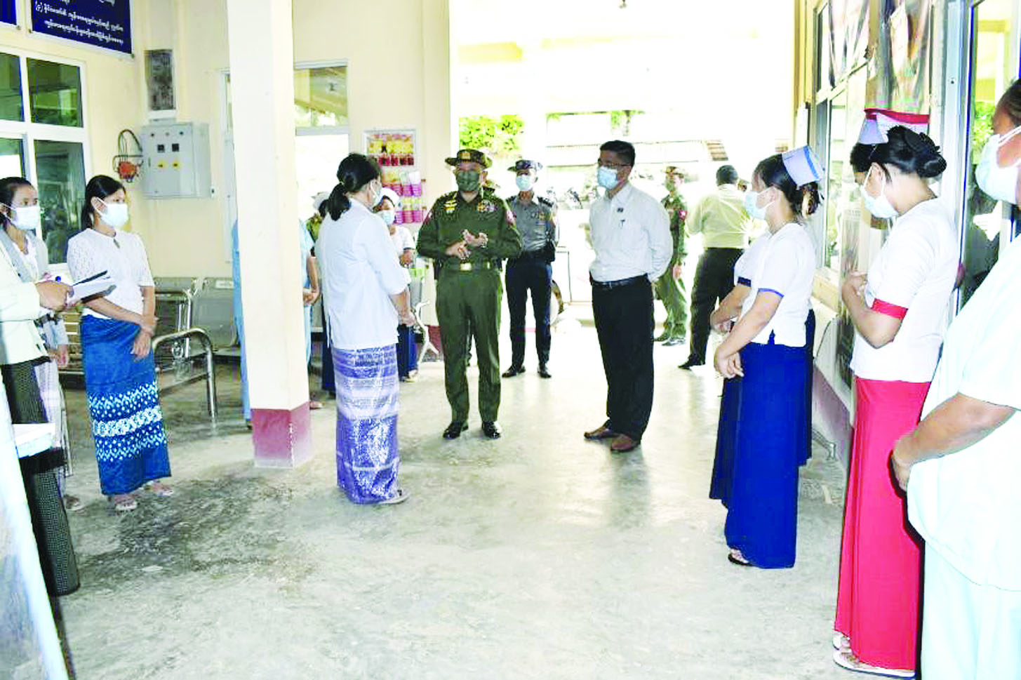 ဆက်လက်၍ ပြည်နယ်ဝန်ကြီးချုပ်သည် မြို့နယ် ပြည်သူ့ဆေးရုံကြီးသို့ သွားရောက်ကာ မြို့နယ်ကုသ ရေးဦးစီးမှူးနှင့် ဝန်ထမ်းများအား တွေ့ဆုံနှုတ်ဆက်၍ ကျန်းမာရေးဝန်ထမ်းများအား ထောက်ပံ့ငွေနှင့် ပစ္စည်း များပေးအပ်ပြီးနောက် ဆေးရုံကြီးရှိ ဆေးသိုလှောင်ရုံ တွင် ဆေးဝါးများ စနစ်တကျ ထားသိုမှုအခြေအနေ များကို ကြည့်ရှုစစ်ဆေးခဲ့သည်။