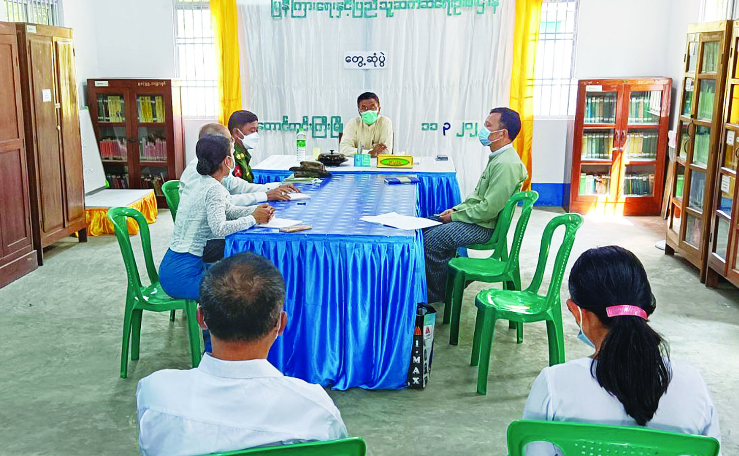 ယင်းနောက် နတ်မောက် မြို့နယ် ပြန်ကြားရေးနှင့် ပြည်သူ့ ဆက်ဆံရေးဦးစီးဌာနကို ရောက် ရှိကာ နိုင်ငံတော်ခွင့်ပြုငွေဖြင့် တည်ဆောက်ပြီး ဖွင့်လှစ်ဝန်ဆောင် မှုပေးရန် ပြင်ဆင်ဆောင်ရွက်နေ သည့် လူထုအခြေပြုဗဟိုဌာနကို ကြည့်ရှုစစ်ဆေးသည်။