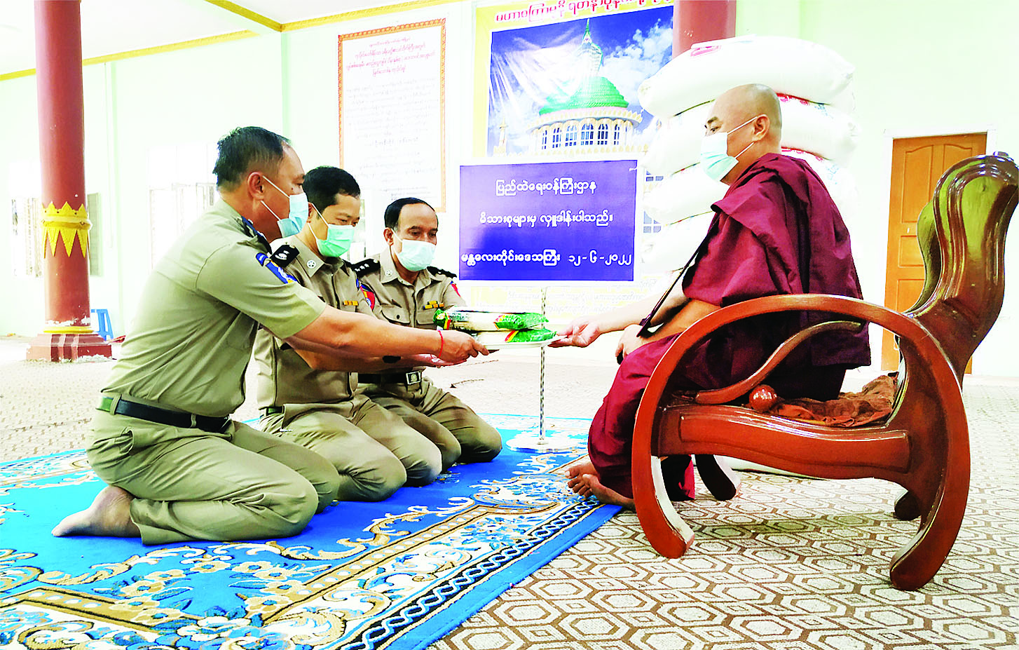 ပြည်ထဲရေးဝန်ကြီးဌာန တပ်ဖွဲ့ဝင်/ဝန်ထမ်း အရာ ထမ်း၊ အမှုထမ်းမိသားစုများက မြို့နယ်အသီးသီးရှိ ဘုန်းတော်ကြီးကျောင်းများသို့ ဆွမ်းဆန်တော်များ ဆက်ကပ်လှူဒါန်းလျက်ရှိသည်။