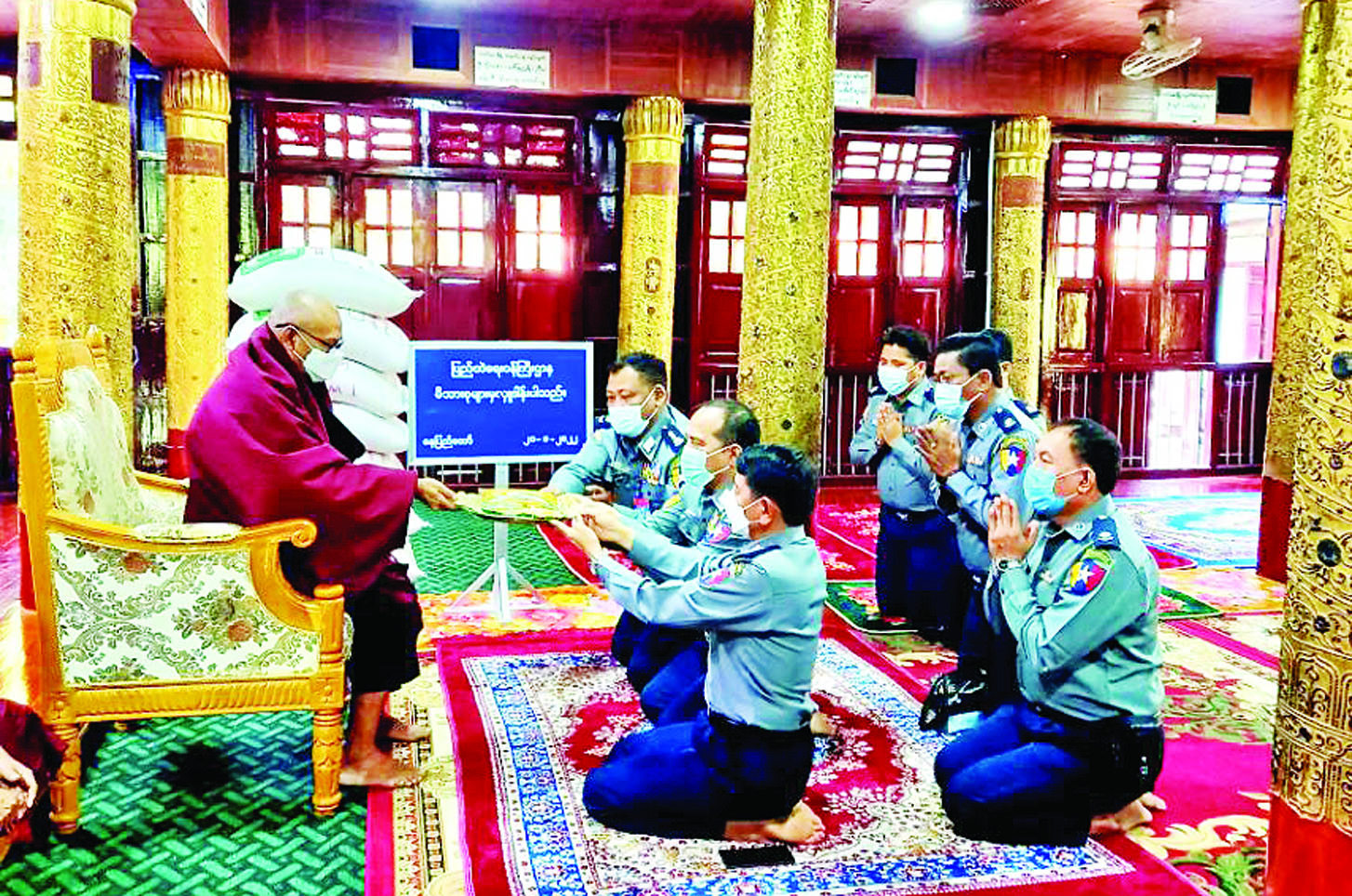 ပြည်ထဲရေးဝန်ကြီးဌာန၊ တပ်ဖွဲ့ဝင်/ဝန်ထမ်း အရာထမ်း၊ အမှုထမ်းမိသားစုများက မြို့နယ်အသီးသီးရှိ ဘုန်းတော်ကြီးကျောင်းများသို့ ဆွမ်းဆန်တော်များ ဆက်ကပ်လှူဒါန်းခြင်းကို ဆောင်ရွက်လျက်ရှိသည်။