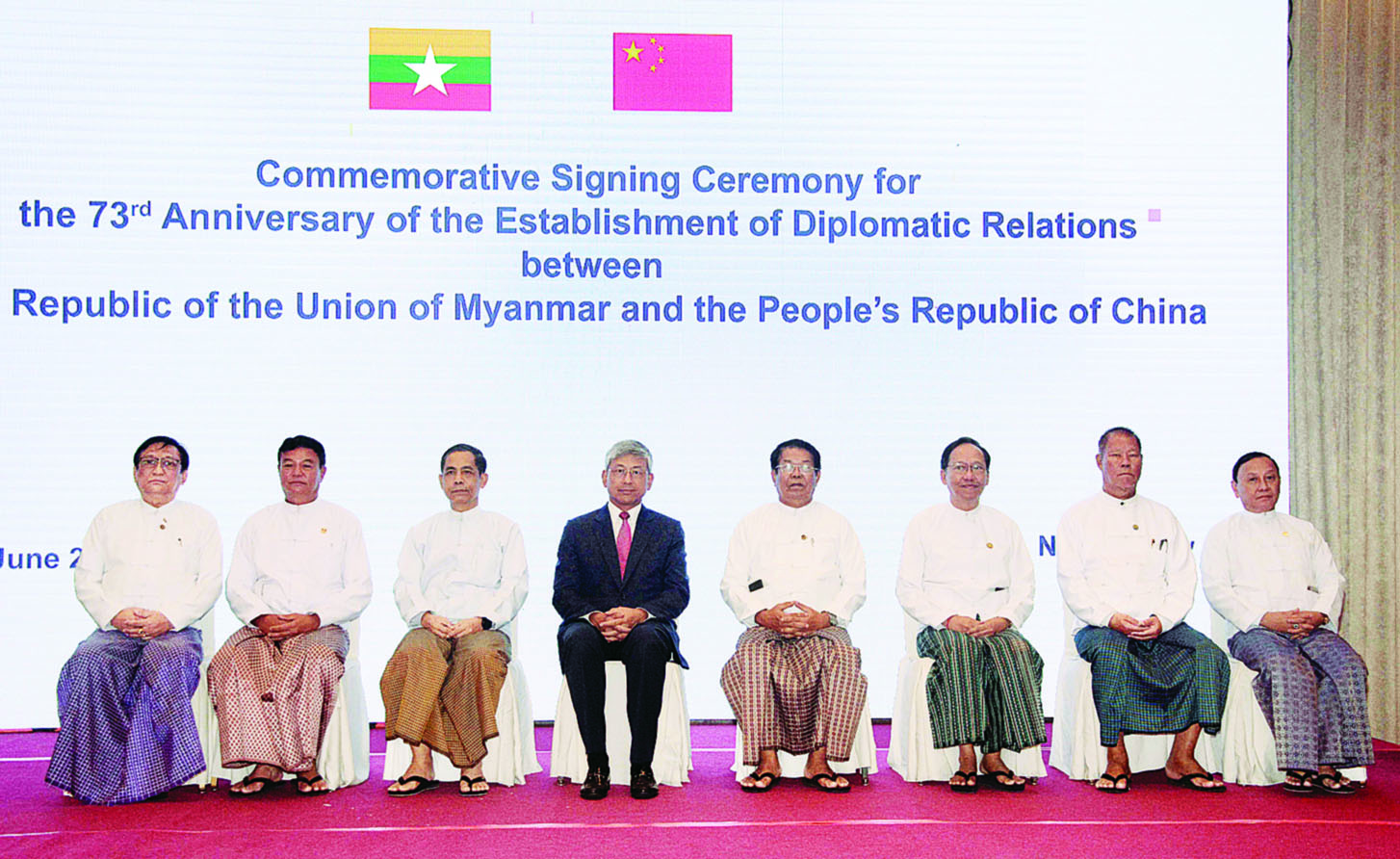 ပြည်ထောင်စုသမ္မတ မြန်မာနိုင်ငံနှင့် တရုတ်ပြည်သူ့သမ္မတနိုင်ငံတို့ အကြား သံတမန်ဆက်ဆံရေး ထူထောင်မှု (၇၃) နှစ်မြောက် နှစ်ပတ်လည်နေ့ အထိမ်းအမှတ်အဖြစ် မြန်မာ-တရုတ် နှစ်နိုင်ငံအကြား ပူးပေါင်းဆောင်ရွက်မှု ဆိုင်ရာ သဘောတူညီချက်များ လက်မှတ် ရေးထိုးသည့် အခမ်းအနားတစ်ရပ်ကို ယနေ့ မွန်းလွဲပိုင်းတွင် နေပြည်တော် ရှိ M-Gallery ဟိုတယ်၌ ကျင်းပ ပြုလုပ်သည်။