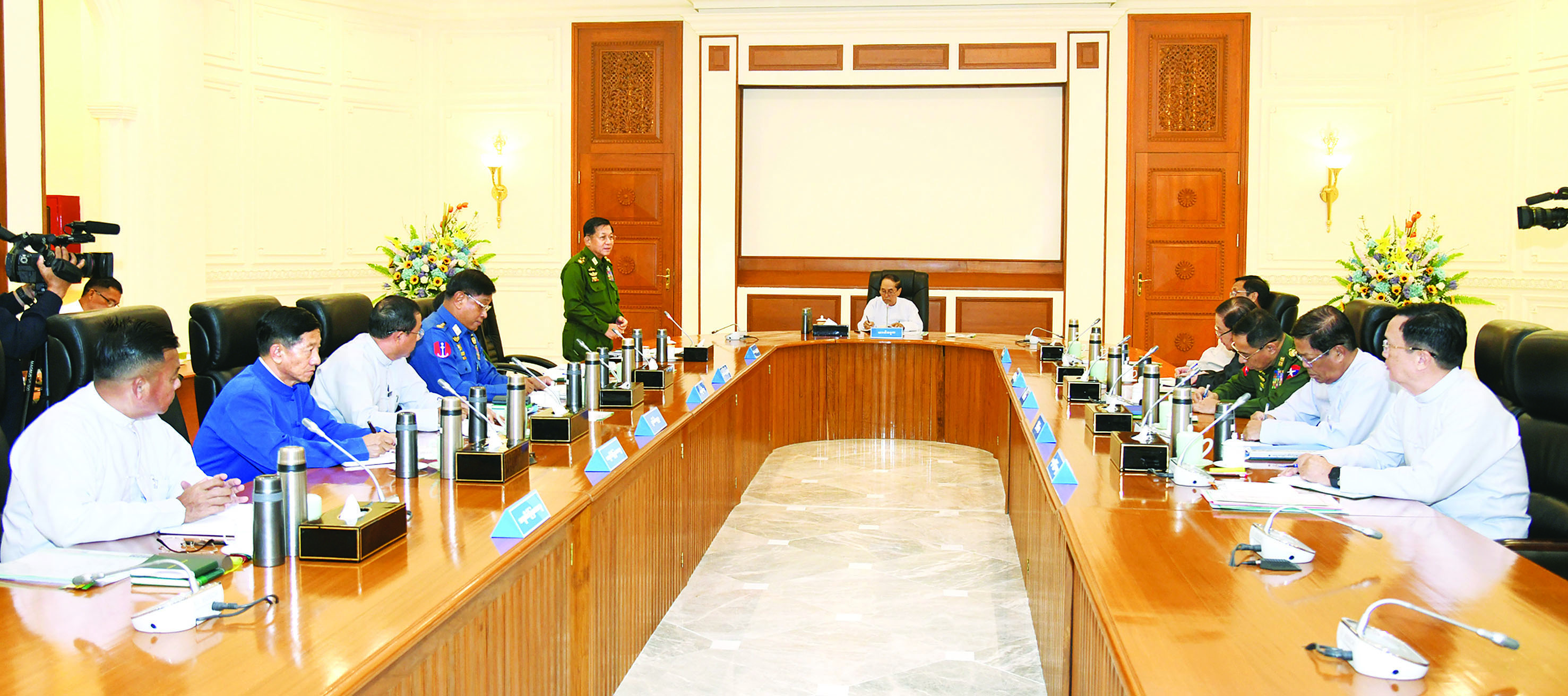 ထို့နောက် ကာကွယ်ရေးဝန်ကြီးဌာန ပြည်ထောင်စု ဝန်ကြီး၊ ပြည်ထဲရေးဝန်ကြီးဌာန ပြည်ထောင်စု ဝန်ကြီး၊ နိုင်ငံခြားရေးဝန်ကြီးဌာန ပြည်ထောင်စု ဝန်ကြီး၊ နယ်စပ်ရေးရာဝန်ကြီးဌာန ပြည်ထောင်စုဝန်ကြီးနှင့်အထူးဖိတ်ကြားထားသူများက မြောက်ပိုင်း တိုင်းစစ်ဌာနချုပ်နယ်မြေ၊ အရှေ့မြောက်တိုင်း စစ်ဌာနချုပ်နယ်မြေ၊အရှေ့တောင်တိုင်းစစ်ဌာနချုပ် နယ်မြေ၊ အနောက် မြောက်တိုင်းစစ်ဌာနချုပ်နယ်မြေတို့တွင် လက်နက် ကိုင် အကြမ်းဖက်သောင်းကျန်းသူအဖွဲ့များက တပ်စခန်းငယ်များ၊ ရဲစခန်းများ၊ မီးသတ် စခန်းများကို တိုက်ခိုက်ခဲ့မှု၊ အစိုးရအဆောက်အဦနှင့် လမ်း၊ တံတားများအား မီးရှို့ဖျက်ဆီးခြင်း လုပ်ဆောင် ခဲ့မှု၊ စစ်ကိုင်းတိုင်းဒေသကြီးရှိ အချို့မြို့နယ်များတွင် NUG လက်အောက်ခံ PDF အမည်ခံ အကြမ်းဖက် အဖွဲ့များက ကျေးရွာများတွင် ဆက်ကြေးကောက်ခံ ခြင်းနှင့် ပြည်သူလူထုအား ရက်စက်စွာ သတ်ဖြတ် ခြင်းများ လုပ်ဆောင်ခဲ့မှု၊ အကြမ်းဖက်သောင်းကျန်း သူများကို ပြည်သူနှင့်တပ်မတော်ပူးပေါင်း၍ ထိရောက် စွာ တုံ့ပြန်ဆောင်ရွက်သွားရေး၊ တရားဥပဒေစိုးမိုးရေး နှင့် နယ်မြေဒေသတည်ငြိမ်အေးချမ်းရေး အမြန်ဆုံး ပြန်လည်ရရှိအောင် ဆောင်ရွက်ရေးနှင့် ကယ်ဆယ် ရေးစခန်းများဖွင့်လှစ်၍ တိုက်ပွဲရှောင်ပြည်သူများ အား ကူညီစောင့်ရှောက်ပေးနေမှု ကိစ္စရပ်များကို ရှင်းလင်းတင်ပြကြသည်။