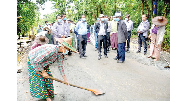 ယင်းနောက် ပြည်ထောင်စု ဝန်ကြီးနှင့်အဖွဲ့သည် ကျိုက်လတ် မြို့နယ် အိပ်ယာကြီးကျေးရွာတွင် CERP အရ အကောင်အထည်ဖော် ဆောင်ရွက်လျက်ရှိသည့် Cash for Work စီမံကိန်း လုပ်ငန်းများကို ကြည့်ရှုစစ်ဆေးအားပေးသည်။