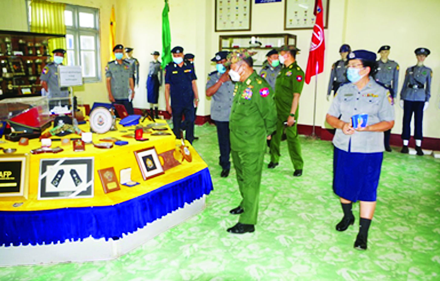 ပြည်ထောင်စုဝန်ကြီးနှင့် အဖွဲ့သည် ရဲအရာရှိ လေ့ကျင့်ရေးကျောင်းရှိ E-Library နှင့် စာကြည့်တိုက်၊ နည်းပညာပြခန်း၊ Audio Lab ၊ သရုပ်ပြခန်း၊ သင်တန်းသားစာသင်ခန်းများ၊ ကွန်ပျူတာလက်တွေ့ ခန်း၊ ကျောင်းပြတိုက်၊ ဆောက်လုပ်ဆဲ လေးထပ် စာသင်ဆောင်၊ အရာရှိရိပ်သာနှင့် စစ်နည်းဗျူဟာ လေ့ကျင့်ရေးကွင်း၌ သင်တန်းသားများ စစ်နည်း ဗျူဟာဘာသာရပ် သင်ကြားလေ့ကျင့်နေမှုတို့ကို လှည့်လည် ကြည့်ရှုစစ်ဆေးသည်။