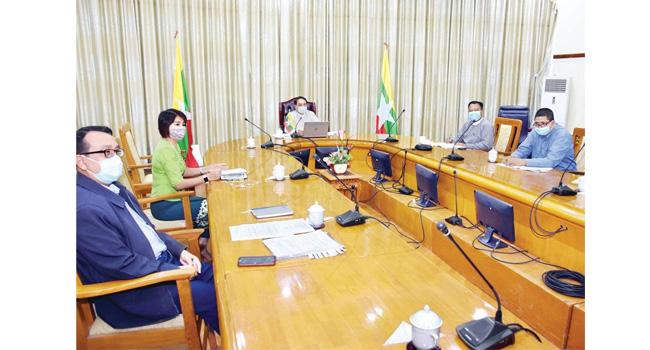 စီမံကိန်း၊ ဘဏ္ဍာရေးနှင့် စက်မှုဝန်ကြီး ဌာန ပြည်ထောင်စုဝန်ကြီး ဦးစိုးဝင်း သည် ယနေ့ နံနက် ၁၀ နာရီတွင် အာရှဖွံ့ဖြိုးရေးဘဏ်၏ မြန်မာနိုင်ငံ ဆိုင်ရာ Country Director Mr. Newin Sinsiri နှင့် နေပြည်တော်ရှိ စီမံကိန်း၊ ဘဏ္ဍာရေးနှင့် စက်မှုဝန်ကြီးဌာန ပြည်ထောင်စုဝန်ကြီးရုံး အစည်းအဝေး ခန်းမ၌ Virtual Meeting ဖြင့် တွေ့ဆုံဆွေးနွေးသည်။
