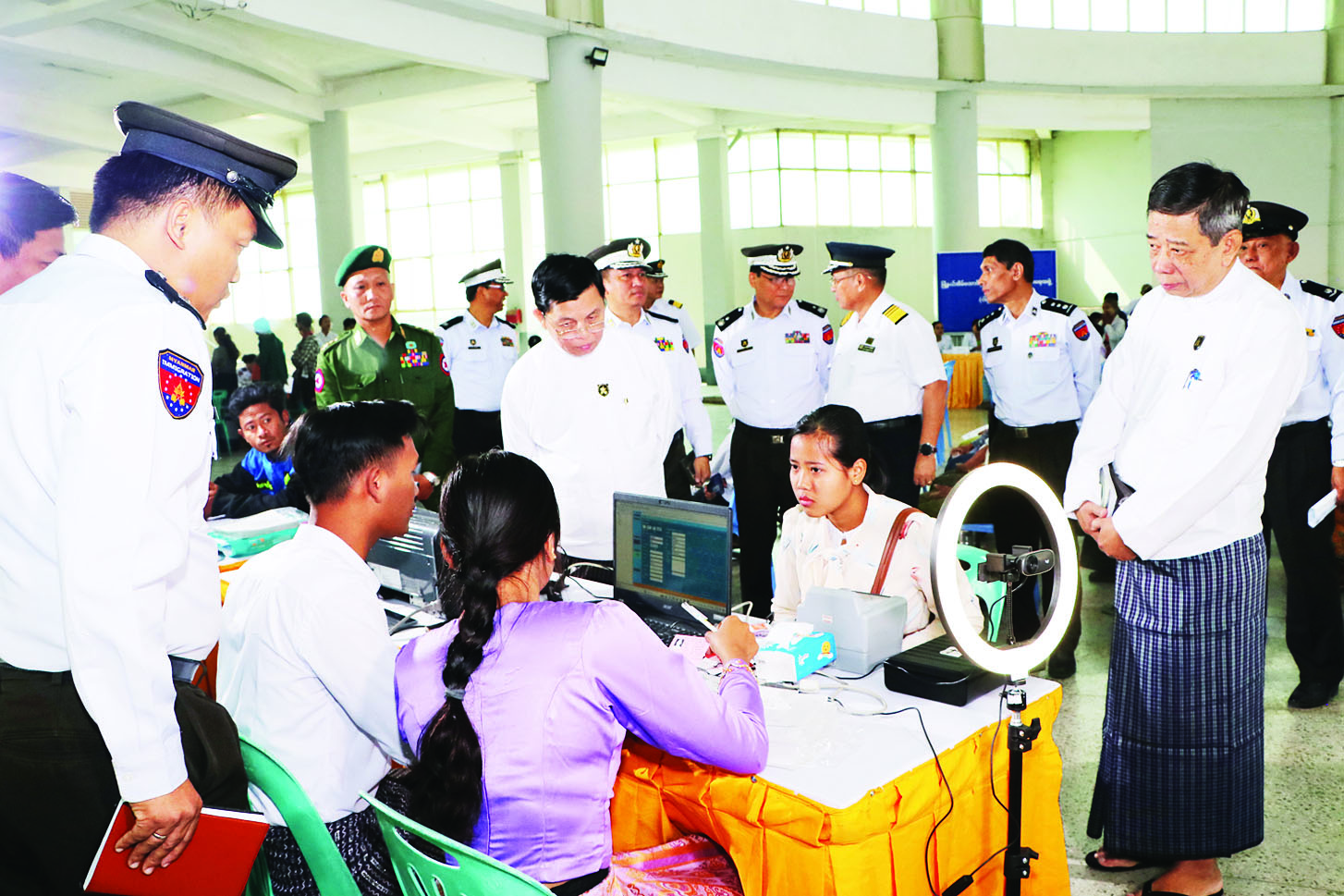 ယင်းနောက် ပြည်ထောင်စု ဝန်ကြီးသည် ပျဉ်းမနားမြို့နယ် ဦးစီးမှူးရုံးသို့ ရောက်ရှိပြီး နိုင်ငံ သားစိစစ်ရေးကတ်ပြား မရှိသေး သူ၊ လဲလှယ်လျှောက်ထားသူ ဒေသခံပြည်သူများကို ပန်းခင်း စီမံချက်ဖြင့် စိစစ်ဆောင်ရွက်ပေး နေမှု၊ ယင်းသို့ဆောင်ရွက်ပြီးပါက e-ID စနစ်အတွက် Biographic/Biometric ကောက်ယူခြင်း လုပ်ငန်းကို တစ်ပါတည်းဆောင် ရွက်ပေးနေမှုနှင့် နိုင်ငံသား ကတ်ပြား ရှိပြီးသူများကိုလည်း Biometric ကောက်ယူ၍ ဂဏန်း (၁၀) လုံးပါ Unique ID နံပါတ် ထုတ်ပေးနေမှုကို လှည့်လည် ကြည့်ရှုကာ လာရောက်ဆောင် ရွက်ကြသည့် ဒေသခံပြည်သူများ ကို ရင်းရင်းနှီးနှီး နှုတ်ဆက် အားပေးသည်။