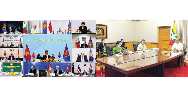 အစည်းအဝေးတွင် ပြည်ထောင်စုဝန်ကြီးက မြန်မာနိုင်ငံအနေဖြင့် ကိုဗစ်-၁၉ ကာကွယ် ကုသ ထိန်းချုပ်ရေးနှင့် စီးပွားရေးကုစားမှုအစီအစဉ်များကို ကိုဗစ်-၁၉ စီးပွားရေးထိခိုက်မှု သက်သာရေးစီမံချက်(CERP) ရေးဆွဲ၍ တစ်မျိုးသားလုံး လက်တွဲပူးပေါင်းအကောင်အထည်ဖော် ဆောင်ရွက်နေမှု အခြေအနေများ၊ အာဆီယံနှင့် အနာဂတ်တွင် လွတ်လပ်သော ကုန်သွယ်မှုနယ်မြေ စာချုပ်ချုပ်ဆိုရန် အလားအလာရှိသည့်နိုင်ငံများနှင့် ဆွေးနွေးညှိနှိုင်းမှုအခြေအနေ များ၊ စည်းမျဉ်းအခြေခံကုန်သွယ်မှုကို ဆက်လက်ထိန်းသိမ်းနိုင်ရေးအတွက် ကမ္ဘာ့ကုန်သွယ်ရေးအဖွဲ့ ပြုပြင်ပြောင်းလဲရေးလုပ်ငန်းစဉ်များတွင် အာဆီယံ နိုင်ငံများအနေဖြင့် တက်ကြွစွာ ပူးပေါင်းဆောင်ရွက်ရန်လိုအပ်မှုများ၊ အေအီးစီကို အကောင်အထည်ဖော်ရာတွင် မြန်မာနိုင်ငံအနေဖြင့် ကျန်အဖွဲ့ဝင်နိုင်ငံများ၊ ပုဂ္ဂလိကကဏ္ဍအဖွဲ့အစည်းများနှင့် ပူးပေါင်းဆောင်ရွက်မှုများကို ဆွေးနွေးသည်။