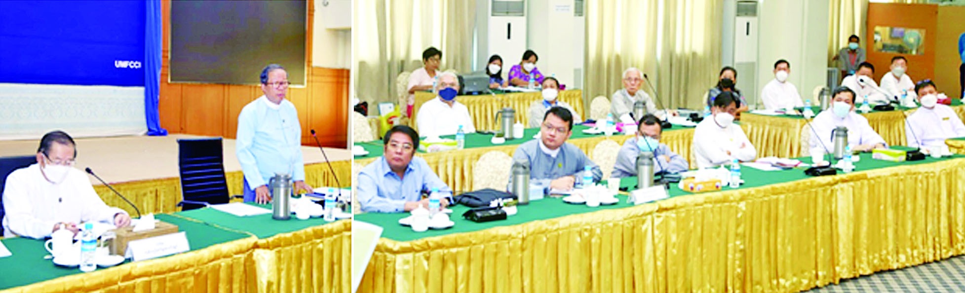 ဆီကုန်သည်များ၊ ဆီစက်လုပ်ငန်းရှင်များ၊ ပဲနှမ်းကုန်သည်များနှင့် လုပ်ငန်းညှိနှိုင်း ဆွေးနွေးပွဲကို ယနေ့နံနက်ပိုင်းက ရန်ကုန်မြို့ မင်းရဲကျော်စွာ လမ်းရှိ မြန်မာနိုင်ငံကုန်သည်များနှင့် စက်မှုလက်မှုလုပ်ငန်းရှင်များအသင်းချုပ် UMFCCI ရုံး အစည်းအဝေးခန်းမ၌ ကျင်းပသည်။