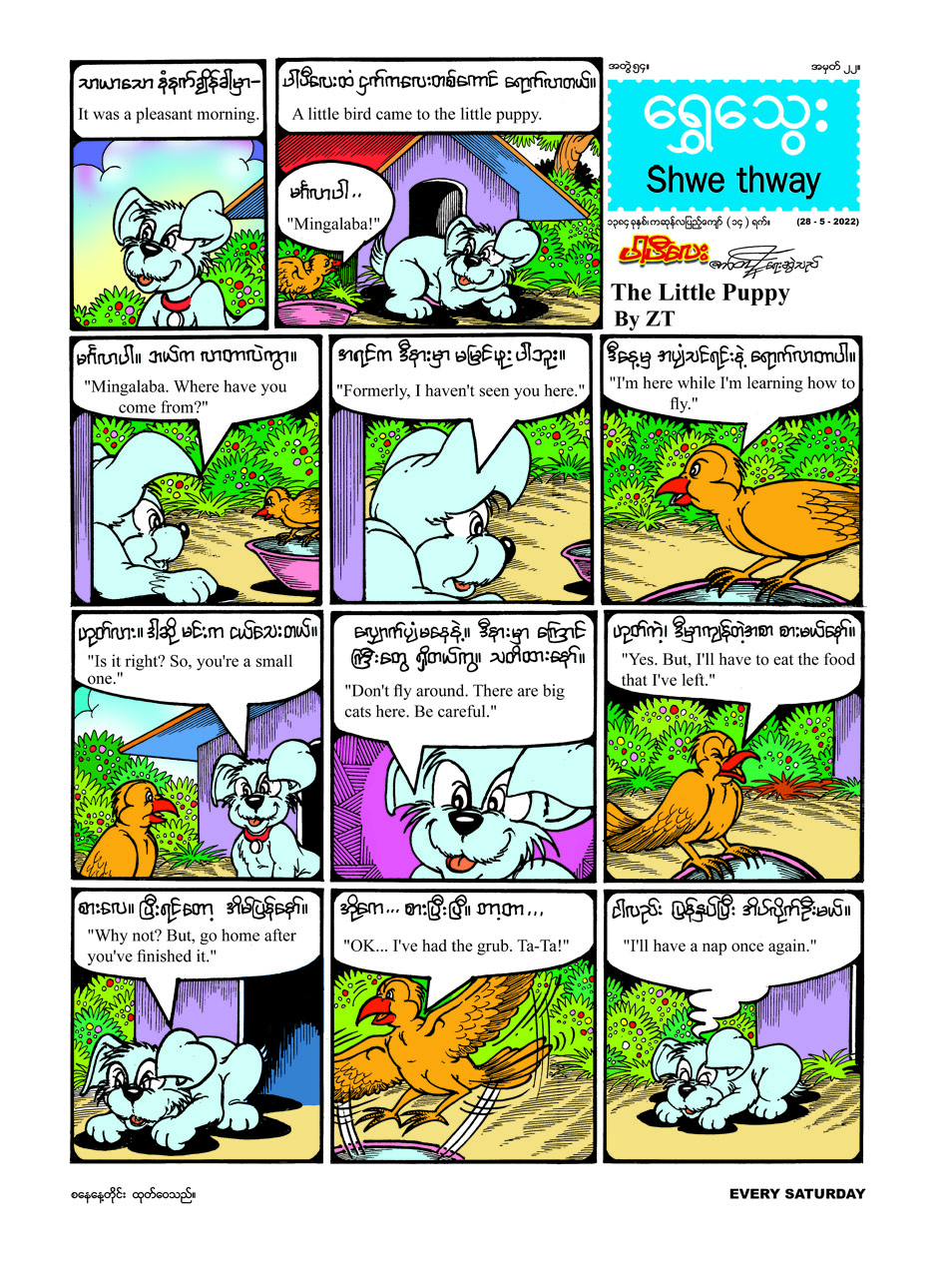 ၂၈-၅-၂၀၂၂ ရက် (စနေနေ့) တွင် ထွက်ရှိမည့် ရွှေသွေးဂျာနယ် အတွဲ (၅၄) အမှတ်(၂၂) ၌ အပျံသင်စငှက်ငယ်လေးကို အကူအညီပေးခဲ့သော ပါပီလေးအကြောင်း ရေးဖွဲ့ထားသည့် “ပါပီလေး” မျက်နှာဖုံး ကာတွန်း၊ “ဥမင်လိုဏ်ခေါင်း” အကြောင်းကို ကလေးတို့ ဗဟုသုတ ဖြစ်ဖွယ်တင်ဆက် ထားသည့် သုတဆောင်းပါး၊ သူငယ်ချင်း၏ စေတနာအမှန်ကို နားလည်သိရှိသွားသော ဖိုးလုံးအကြောင်းကို တင်ဆက်ထားသည့် “ရွှေဖဲ” နှစ်မျက်နှာကာတွန်း၊ မြိုင်သည် သူ၏အဘိုးကို ပြောခဲ့သော အလုပ်သုံးခုကို အမှန်တကယ် လုပ်ဆောင်နိုင်ခဲ့ပုံအကြောင်း ရေးဖွဲ့ထားသည့် “နေကြာဘွားဘွား” ဝတ္ထု ကဏ္ဍ ၊ ဦးလေး၏ ဘောင်းဘီကို မီးပူတိုက် ပေးလိုက်သော အာတူးအကြောင်းကို ရေးဖွဲ့ ထားသည့် “အာတူးရဲ့ စားရခါနီးမှ” တစ်မျက်နှာကာတွန်း၊ စာပေဗိမာန်စိန်ရတု အထိမ်းအမှတ်အဖြစ် ပြုလုပ်သော ရွှေသွေး တို့လက်ရာ စာစီစာကုံးပြိုင်ပွဲတွင် ဆန်ခါ တင်အဆင့် ရွေးချယ်ခံရသည့် “ကျောင်း စာကြည့်တိုက်”စာစီစာကုံး ကဏ္ဍအပါအဝင် ဉာဏ်စမ်းကဏ္ဍ၊ အင်္ဂလိပ်စကားဝိုင်းကဏ္ဍ နှင့် ကဗျာကဏ္ဍစုံလင်စွာဖြင့် ထွက်ရှိပြီ ဖြစ်ရာ တစ်စောင်လျှင် ငွေကျပ် ၄၀၀ ဖြင့် စာပေဗိမာန် စာအုပ်အရောင်းဆိုင်များတွင် ဝယ်ယူနိုင်ကြောင်း သိရသည်။
