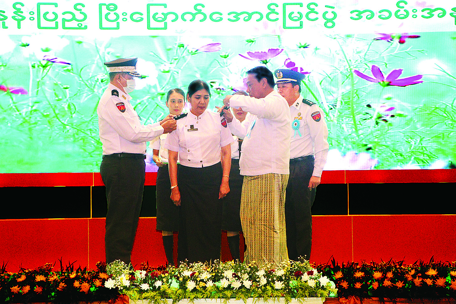 ယင်းနောက် ပြည်ထောင်စု ဝန်ကြီးသည် ပန်းခင်းစီမံချက် ပြီးမြောက်အောင်မြင်အောင် ပံ့ပိုး ကူညီ ဆောင်ရွက်ပေးကြသည့် တိုင်းဒေသကြီး ဝန်ကြီးချုပ်၊ တိုင်းမှူးနှင့် တိုင်းအဆင့် တာဝန်ရှိ သူများကို ဂုဏ်ပြုမှတ်တမ်းလွှာ များ ပေးအပ်ပြီး ပန်းခင်းစီမံချက် ကို စွမ်းစွမ်းတမံ ဆောင်ရွက်ခဲ့ကြ သည့် ဝန်ထမ်းများကို တစ်ဆင့် မြင့် ရာထူးတိုးမြှင့်ပေးကာ ရာထူးတံဆိပ်များ တပ်ဆင်ပေး သည်။