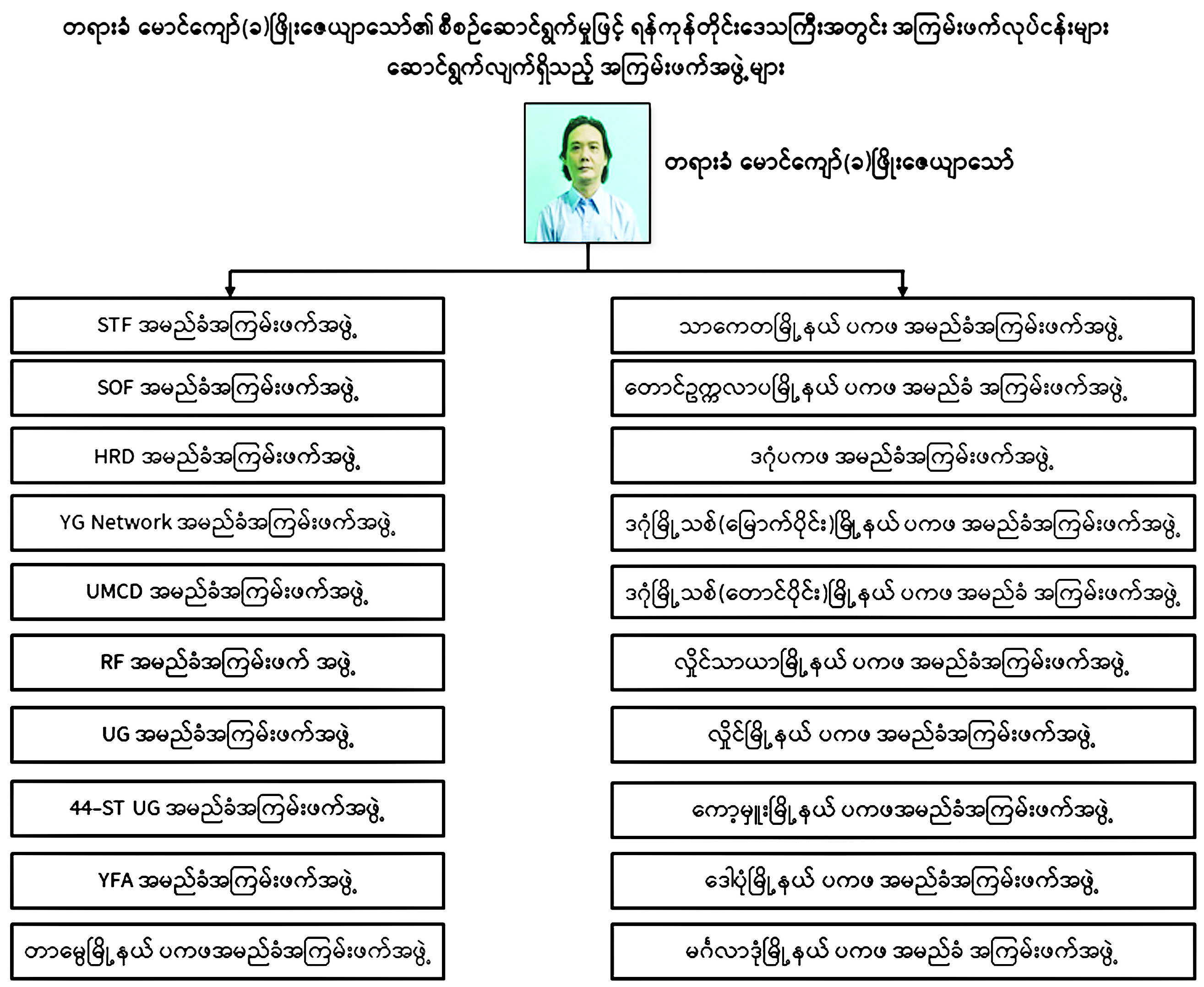 တရားခံ မောင်ကျော်(ခ) ဖြိုးဇေယျာသော်သည် STF အမည်ခံအကြမ်းဖက်အဖွဲ့၊ SOF အမည်ခံ အကြမ်းဖက်အဖွဲ့၊ HRD အမည်ခံအကြမ်းဖက်အဖွဲ့၊ YG Network အမည်ခံအကြမ်းဖက်အဖွဲ့၊ UMCD အမည်ခံအကြမ်းဖက်အဖွဲ့၊ RF အမည်ခံအကြမ်းဖက် အဖွဲ့၊ UG အမည်ခံအကြမ်းဖက်အဖွဲ့၊ 44-ST UG အမည်ခံအကြမ်းဖက်အဖွဲ့၊ YFA အမည်ခံအကြမ်း ဖက်အဖွဲ့၊ တာမွေမြို့နယ် ပကဖအမည်ခံ အကြမ်းဖက် အဖွဲ့၊ သာကေတမြို့နယ် ပကဖအမည်ခံအကြမ်းဖက် အဖွဲ့၊ တောင်ဥက္ကလာပမြို့နယ် ပကဖအမည်ခံ အကြမ်းဖက်အဖွဲ့၊ ဒဂုံ ပကဖ အမည်ခံအကြမ်းဖက် အဖွဲ့၊ ဒဂုံမြို့သစ်(မြောက်ပိုင်း) မြို့နယ် ပကဖ အမည်ခံအကြမ်းဖက်အဖွဲ့၊ ဒဂုံမြို့သစ်(တောင်ပိုင်း)မြို့နယ် ပကဖ အမည်ခံ အကြမ်းဖက်အဖွဲ့၊ လှိုင်သာယာမြို့နယ် ပကဖ အမည်ခံအကြမ်းဖက် အဖွဲ့၊ လှိုင်မြို့နယ် ပကဖ အမည်ခံအကြမ်းဖက်အဖွဲ့၊ ကော့မှူးမြို့နယ် ပကဖအမည်ခံအကြမ်းဖက်အဖွဲ့၊ ဒေါပုံမြို့နယ် ပကဖ အမည်ခံအကြမ်းဖက်အဖွဲ့၊ မင်္ဂလာဒုံမြို့နယ် ပကဖ အမည်ခံအကြမ်းဖက် အဖွဲ့စသည့် အကြမ်းဖက်အဖွဲ့ (၂၀) ကို အကြမ်းဖက် NUG အဖွဲ့ထံမှ ရရှိခဲ့သော လက်နက်/ ခဲယမ်းများထုတ်ပေးကာ ရန်ကုန်တိုင်းဒေသကြီး အတွင်း အကြမ်းဖက်လုပ်ငန်းများနှင့် အပြစ်မဲ့ ပြည်သူများအား လုပ်ကြံသတ်ဖြတ်ခြင်းများ ဆောင် ရွက်ခဲ့ကြောင်း ဖော်ထုတ်သိရှိရသည်။