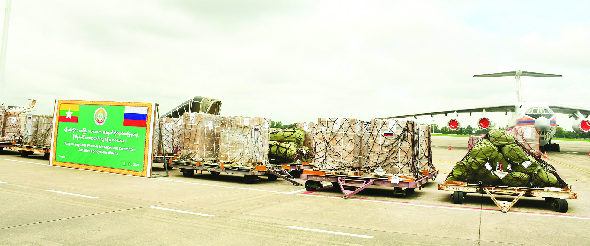 ရုရှားဖက်ဒရေးရှင်းနိုင်ငံက မိုခါဆိုင်ကလုန်းမုန်တိုင်းဘေးသင့်ပြည်သူများအတွက် လူသားချင်းစာနာမှု အကူအညီပစ္စည်းများတင်ဆောင်လာသည့် ကုန်တင်လေယာဉ် ရန်ကုန်အပြည်ပြည်ဆိုင်ရာလေဆိပ်သို့ရောက်ရှိ