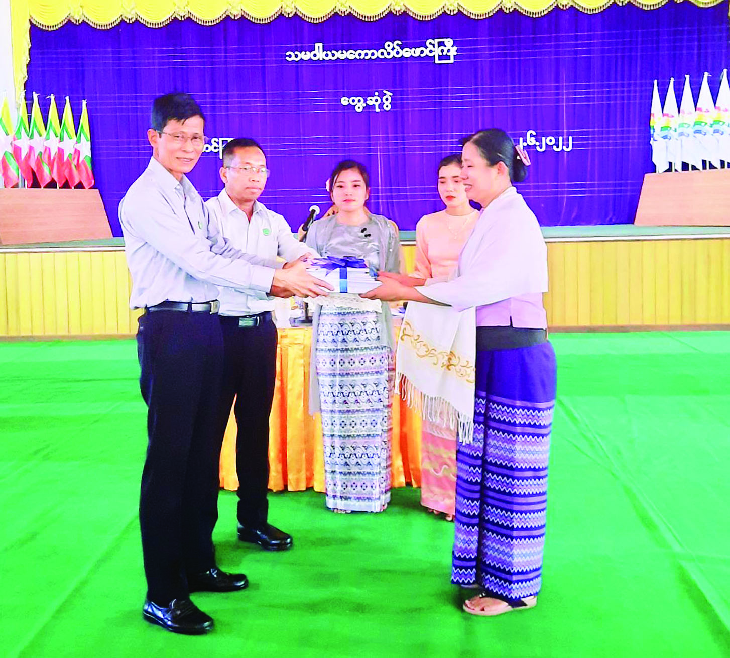 ဆက်လက်၍ ဒုတိယဝန်ကြီး က ကျောင်းသုံးပြဋ္ဌာန်းစာအုပ်များ၊ သင်ထောက်ကူ ပစ္စည်းများနှင့် မြက်ဖြတ်စက်များ ပေးအပ်ရာ ကျောင်းအုပ်ကြီး ဒေါက်တာ တင်လဲ့လဲ့ဝင်းက လက်ခံရယူခဲ့ပြီး ဒုတိယဝန်ကြီးက ပြည်ထောင်စု ဝန်ကြီး၏ ခရီးစဉ်လုပ်ငန်းလမ်းညွှန်ချက်များအပေါ် လိုက်နာ ဆောင်ရွက်ပြီးစီးသည့် အခြေ အနေများနှင့် သမဝါယမပညာ ရပ်များ သင်ယူနေကြသော ကျောင်းသား ကျောင်းသူများကို ကြည့်ရှုအားပေးခဲ့ကြောင်း သိရ သည်။