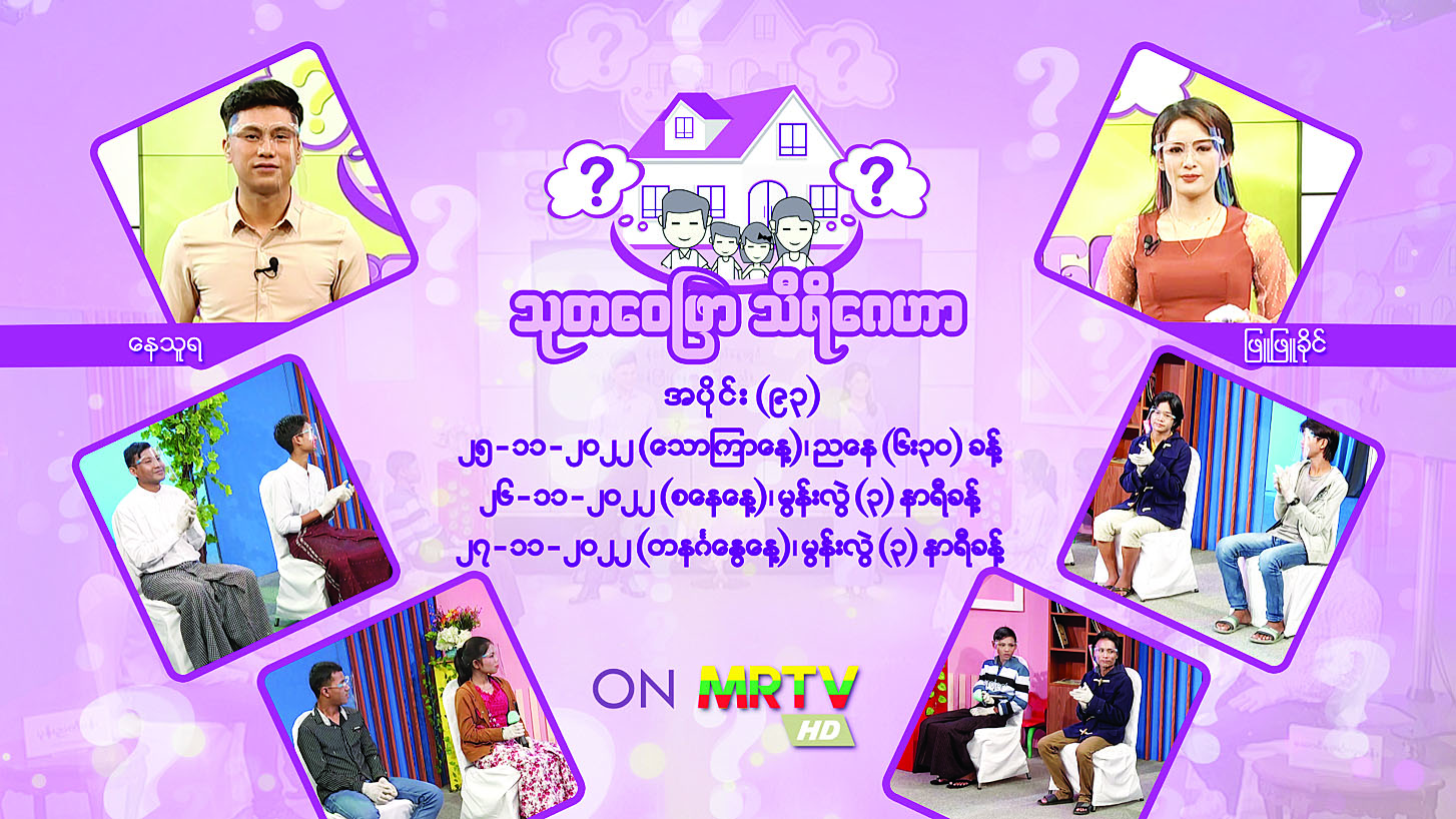 သုတဝေဖြာသီရိဂေဟာ မိသားစု ပြိုင်ပွဲ ကိုဗစ်-၁၉ ဆိုင်ရာ အသိ ပညာပေး အစီအစဉ် (Family Quiz) ပွဲစဉ်(၉၃)ကို နိုဝင်ဘာ ၂၅ ရက်တွင် မြန်မာ့အသံနှင့်ရုပ်မြင် သံကြား၏ MRTV–HD Channel မှ ဆက်လက်ထုတ်လွှင့်မည်ဖြစ်ရာ လူရွှင်တော်အသင်းမှ မိသားစုများ ပါဝင် ယှဉ်ပြိုင်ကြမည်ဖြစ် သည်။