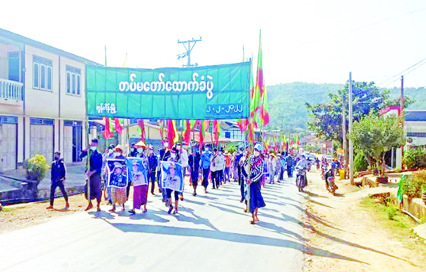 ထိုသို့ ဆန္ဒဖော်ထုတ်ရာတွင် “နိုင်ငံတော်စီမံ အုပ်ချုပ်ရေးကောင်စီအား ထောက်ခံပါသည်၊ အမျိုး ဘာသာ သာသနာကို စောင့်ရှောက်သော မြန်မာ့ တပ်မတော်အား ထောက်ခံပါသည်၊ NUG ၊ CRPH ၊ PDF အကြမ်းဖက်သမားအလိုမရှိ၊ NUG ၊ CRPH ၊ PDF အကြမ်းဖက်လုပ်ရပ်များအား ဆန့်ကျင်ကြ၊ ပြည်ထောင်စုမပြိုကွဲရေး ဒို့အရေး၊ တိုင်းရင်းသား စည်းလုံးညီညွတ်မှုမပြိုကွဲရေး ဒို့အရေး၊ အချုပ်အခြာ အာဏာတည်တံ့ခိုင်မြဲရေး ဒို့အရေး၊ ပြည်ပအားကိုး ပုဆိန်ရိုးများအား ဆန့်ကျင်ကြ၊ တိုင်းပြည်ပြိုကွဲ အောင် ကြံဆောင်သူမှန်သမျှ ဆန့်ကျင်ကြ၊ တိုင်းပြည်တည်ငြိမ်အေးချမ်းဖို့ တပ်မတော်နဲ့ လက်တွဲစို့၊ တိုင်းပြည်သာယာအေးချမ်းရေး တပ်နဲ့ ပြည်သူလက်တွဲပေး၊ မြန်မာ့ပြည်တွင်းရေး ပြည်ပ စွက်ဖက်မှုအလိုမရှိ၊ နိုင်ငံတော်စီမံအုပ်ချုပ်ရေး ကောင်စီ လုပ်ငန်းစဉ်(၅)ရပ်အား ထောက်ခံပါသည်၊ ပြည်ဖျက်သည့် CRPH၊ NUG လူသတ်သည့် PDF ဆန့်ကျင်ကြ၊ NUG၊ PDF အကြမ်းဖက်မှုအမြစ်ဖြတ်၊ NUG၊ PDF အကြမ်းဖက်မှုတွေ မြင်အောင်ကြည့်၊ NUG၊ PDF ရဲ့ ပြည်သူ့အပေါ် အကြမ်းဖက်မှု ချက်ချင်းရပ်’’ စသည့် စာသားပါ ဆိုင်းဘုတ်များ ကိုင်ဆောင်ကြွေးကြော်ခဲ့ကြကြောင်း သတင်းရရှိ သည်။
