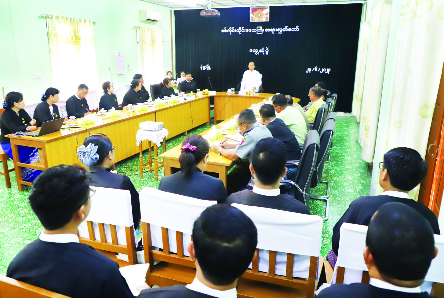 ရှေးဦးစွာ  တိုင်းဒေသကြီး   တရားရေးဦးစီးမှူး ဦးကျော်သောင်းအောင်က တိုင်းဒေသကြီးအတွင်းရှိ ခရိုင်/မြို့နယ်များ၏ တရားစီရင်ရေးဆိုင်ရာကိစ္စရပ် များ ဆောင်ရွက်နေမှုအခြေအနေများကို ရှင်းလင်း တင်ပြသည်။