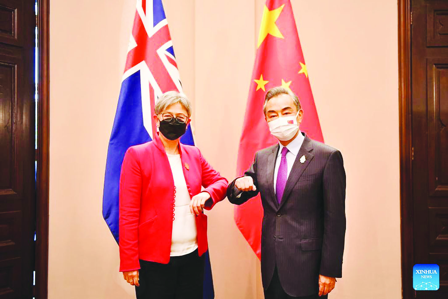 တရုတ်နိုင်ငံတော် ကောင်စီဝင် နိုင်ငံခြားရေးဝန်ကြီး မစ္စတာ ဝမ်ယိသည် ဩစတြေးလျ နိုင်ငံ ခြားရေးဝန်ကြီး ပင်နီဝေါင်းနှင့် ဇူလိုင် ၈ ရက်က တွေ့ဆုံခဲ့ကြရာ အတားအဆီးများကို ဖယ်ရှားပြီး နှစ်နိုင်ငံဆက်ဆံရေး လမ်းကြောင်း မှန်ပေါ် ရောက်ရှိရန် သဘောတူညီ ခဲ့ကြသည်။