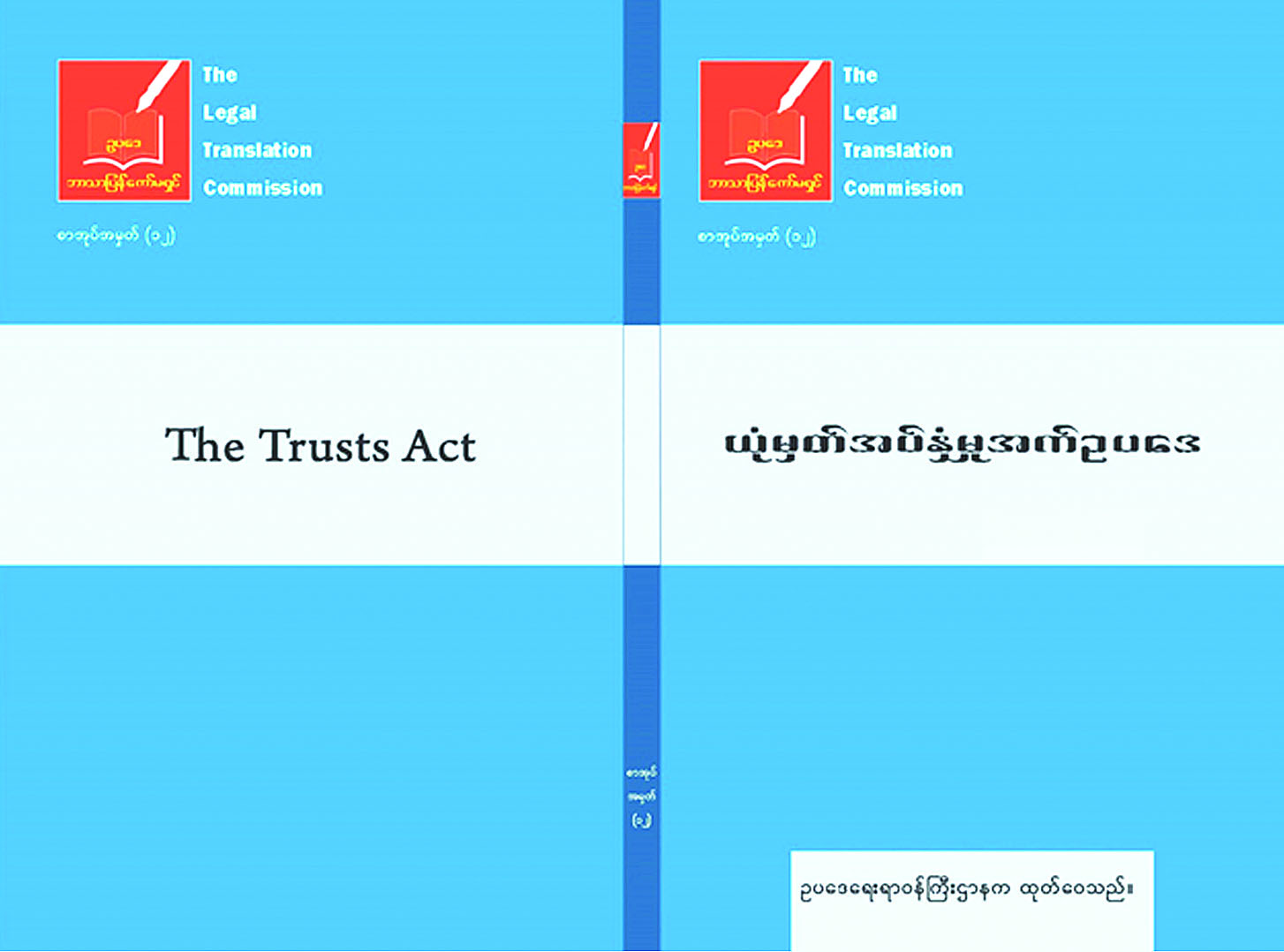 ဥပဒေရေးရာဝန်ကြီးဌာနသည် ဥပဒေဘာသာပြန်ကော်မရှင်က မြန်မာဘာသာသို့ ပြန်ဆိုပြီးသည့် ဥပဒေများကို စာအုပ်ထုတ်ဝေ လျက်ရှိရာ ဘာသာပြန်စာအုပ် အမှတ် (၁၂) ယုံမှတ်အပ်နှံမှု အက်ဥပဒေ (The Trusts Act) စာအုပ်ကို ထုတ်ဝေလိုက်သည်။