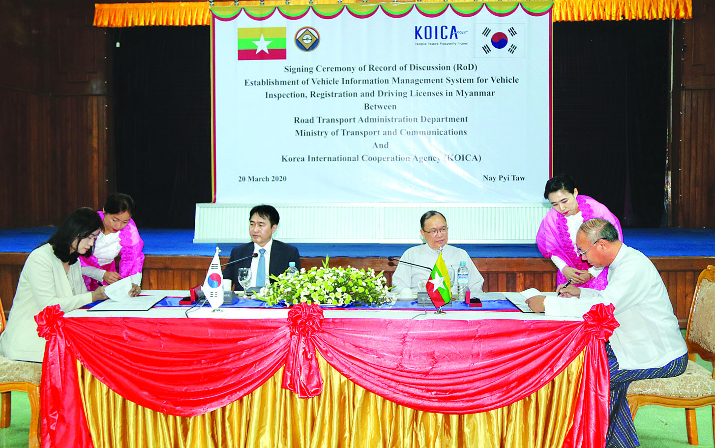 ပို့ဆောင်ရေးနှင့် ဆက်သွယ်ရေးဝန်ကြီးဌာန၊ ကုန်းလမ်းပို့ဆောင်ရေး ညွှန်ကြားမှုဦးစီးဌာနနှင့် ကိုရီးယား သမ္မတနိုင်ငံ Korea International Cooperation Agency (KOICA) တို့သည် “Establishment of Vehicle Information Management System for Vehicle Inspection, Registration and Driving License In Myanmar” Project အတွက် Record of Discussion (RoD) လက်မှတ်ရေးထိုးခြင်းအခမ်းအနားကို ယနေ့နံနက် ၉ နာရီခွဲတွင် နေပြည်တော်ရှိ အဆိုပါဝန်ကြီးဌာန အစည်းအဝေးခန်းမ၌ ကျင်းပသည်။
