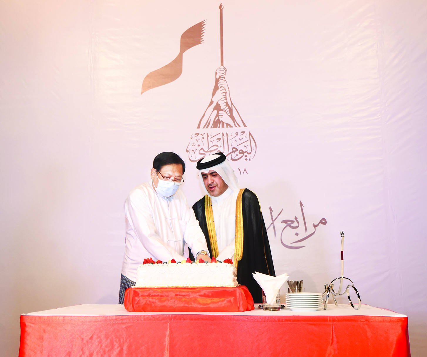 ထို့နောက် နိုင်ငံခြားရေး ဝန်ကြီးဌာန ဒုတိယဝန်ကြီး ဦးကျော်မျိုးထွဋ်နှင့် မြန်မာနိုင်ငံ ဆိုင်ရာ ကာတာနိုင်ငံ သံရုံးယာယီ တာဝန်ခံ Mr. Mansoor Mubarak Al-Khayarin တို့က ကာတာနိုင်ငံ အမျိုးသားနေ့ အထိမ်းအမှတ် ကိတ်ကို လှီးဖြတ်ပေးကြသည်။