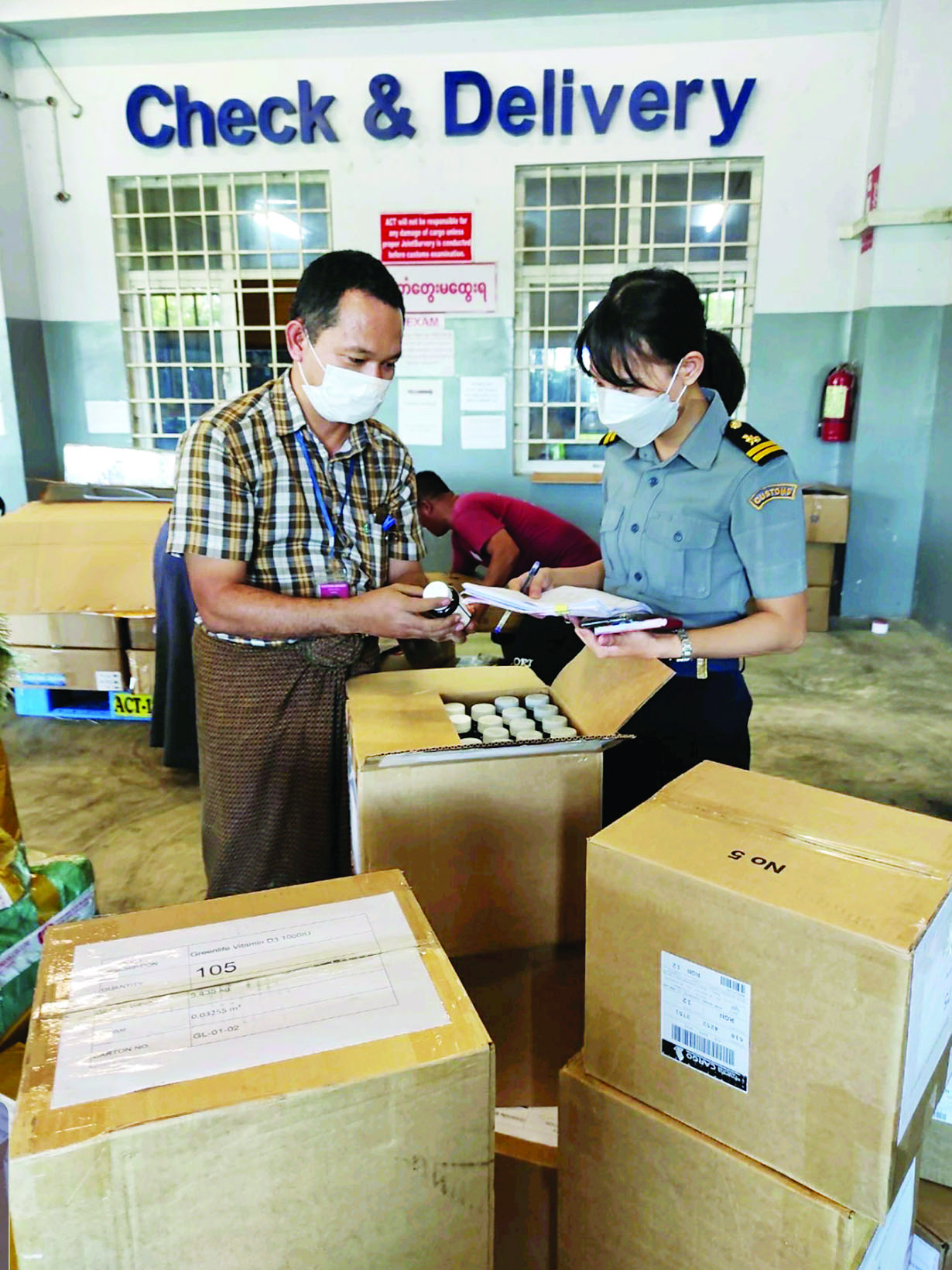 အကောက်ခွန်ဦးစီးဌာနအနေဖြင့် ကိုဗစ်-၁၉ ရောဂါ ကာကွယ်၊ ထိန်းချုပ်၊ ကုသရေးပစ္စည်းများအား ရေကြောင်း၊ ဆိပ်ကမ်း၊ နယ်စပ် ဂိတ်အသီးသီးမှ နေ့စဉ်လွယ်ကူချောမွေ့စွာ စစ်ဆေးထုတ်ပေးလျက်ရှိ သည်။ ဒီဇင်ဘာ ၂၉ ရက်၌ ရန်ကုန်ဆိပ်ကမ်းများမှ Wheel Chair ၁၂၇ ခု၊ Commode Chair ၅၀၀၊ Digital Blood Pressure Monitor ၃၀၀၀၊ Blood Pressure Monitor Bp3UG1-2E ၃၀၀၈၊ AutoMatic Blood Pressure Monitor ၃၀၀၀၊ Blood Pressure Monitor BP3NM1-3E ၃၀၀၀၊ PEN Type Digital Thermometer ၃၀၀၀၊ High Low Stretcher ၂၈ ခု၊ Scoop Stretcher ၂၀၊ Female Examining Table ငါးခု၊ Head Immobilize ၁၀ ခု၊ Stretcher ၅၀၊ Belt For Stretcher ၃၀၊ Electrocardiograph ၂၀၊ Internitient Pneumatic Compression ငါးခု၊ Revolizer ၅၃၂၀၊ ဆေးဝါးမျိုးစုံ ၃၈ မျိုး စုစုပေါင်း ၁၀၈၃၈၃ ဒသမ ၈၅ KG ၊ နယ်စပ်(မြဝတီ၊ ချင်းရွှေဟော်) တွင် ကုမ္ပဏီ သုံးခုတို့မှ Pai Diclo Injection ၂၄၀၀၀ ၊ Sai C Pen Powder For Injection ၁၀၀၆၀၊ Sai P Pen Powder For Injection ၈၅၀၀၊ Disposable Mask 8659 KG ၊ Surgical Gown ၇၅၀၀၊ Liquid Oxygen ၁၅၃၃၈ m3 ၊ Disposable Cap ၈၈၀ KG တို့ကို ထုတ်ပေးခဲ့ကြောင်း သတင်း ရရှိသည်။