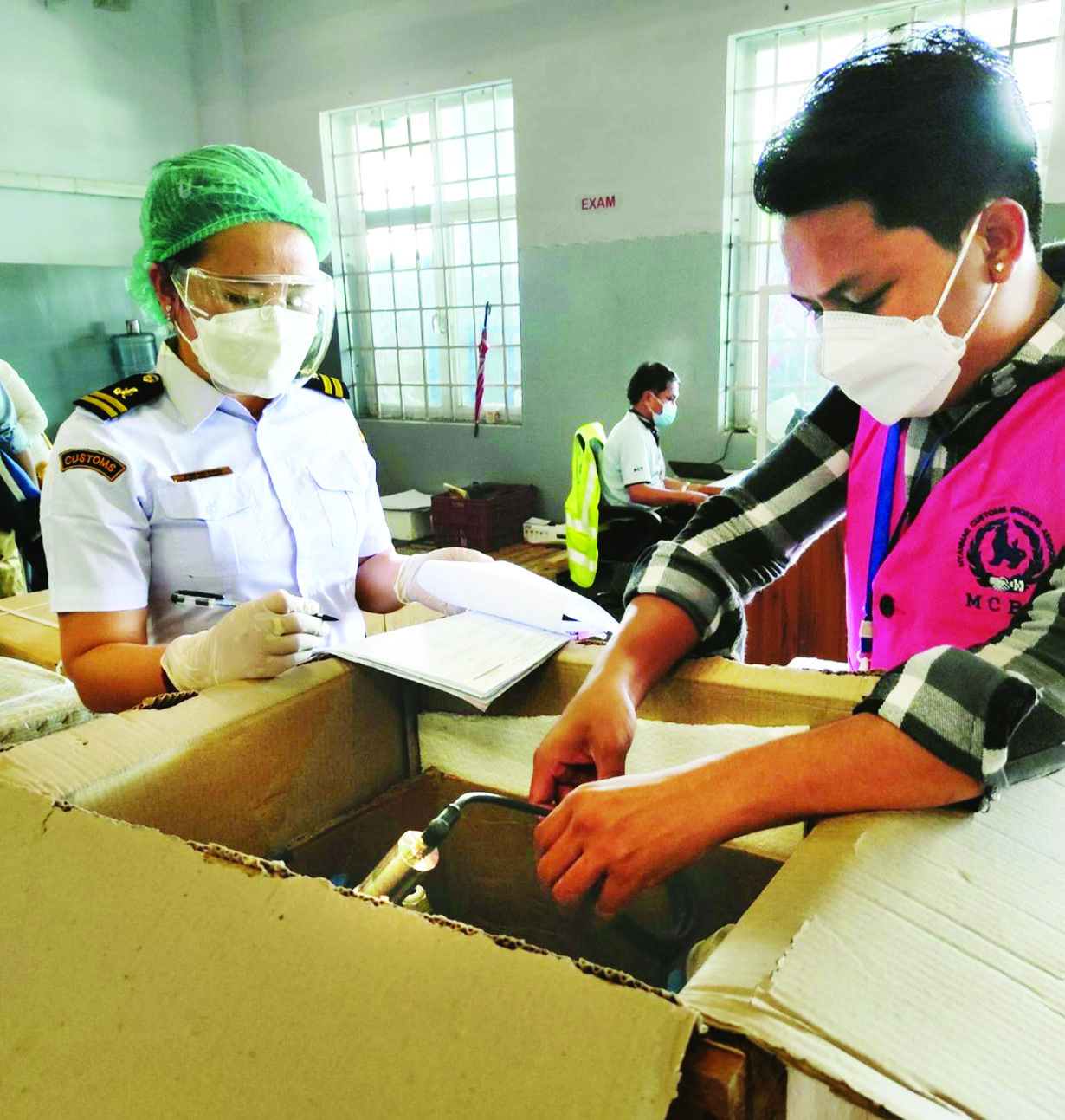 အကောက်ခွန်ဦးစီးဌာနအနေဖြင့် ကိုဗစ်-၁၉ ရောဂါ ကာကွယ်၊ ထိန်းချုပ်၊ ကုသရေးပစ္စည်းများကို ရေကြောင်း၊ လေကြောင်း၊ ဆိပ်ကမ်း၊ နယ်စပ်ဂိတ်အသီးသီးမှ နေ့စဉ်လွယ်ကူချောမွေ့စွာ စစ်ဆေးထုတ်ပေး လျက်ရှိသည်။ စက်တင်ဘာ ၂၀ ရက်က ရန်ကုန်အပြည်ပြည်ဆိုင်ရာ လေဆိပ်တွင် ကုမ္ပဏီ သုံးခုမှ Zinc Tablets ၁၄၆ ခု၊ Paracetamol Tablets ၃၈၃၂ ခု၊ Benzyl Benzoate Lotion ၁၁၅၀၊ Phytomenadi အခု ၆၀၊ Vitamin-C Tablets ၇၀၇၄ ခု၊ Vitamin-C + Zinc Tablets ၅၀၄၄ ခု၊ Amero Powder For Injection အခု ၁၅၀၀၀၊ Faceshield အခု ၁၇၀၀၀၊ Thermometer ၁၂၇၇ ခု၊ Mask အခု ၈၅၀၊ Gloves ၃၂၂ ခု၊ PPE သုံးခု၊ Oxygen Supply ၄၇၆ ခု၊ Flow Splitter For Oxygen Concentrator ၃၄ ခု၊ Pulse Oximeter ၁၇ ခု၊ Iehk 2017, Kit, Basic Unit ၄၂ ခု၊ ရန်ကုန်ဆိပ်ကမ်းများမှ Oxygen Plant အခု ၅၀၊ Oxygen Flow Meter အခု ၂၄၀၀၊ Oxygen Cylinder ၆၈၇ ခု၊ Oxygen Concentrator အခု ၁၈၀ နှင့် ဆေးဝါးမျိုးစုံ ၃၅ မျိုး (၂၆၃၃၃၃ ဒသမ ၅၉)Kg၊ နယ်စပ်(မူဆယ်၊ မြဝတီ၊ ချင်းရွှေဟော်)တွင် ကုမ္ပဏီ ၁၈ ခုတို့မှ Oxygen Cylinder အခု ၃၁၈၀၊ Mask ၂၅၂၀၀ Kg၊ Liquid Oxygen ၁၅၀၆၂ m3၊ Flow Meter/Regulator အခု ၅၆၀၊ PPE ၁၉၆၈ ခု၊ Oxygen Plant ငါးခု၊ Liquid Stroge Container တစ်ခု၊ Oxygen Colling Tower တစ်ခု၊ Liquid Gas Conversion တစ်ခု၊ Oxygen Booster တစ်ခု၊ Supercharger For Oxygen Plant တစ်ခု၊ Sodium Chloride Injection ၆၀၇၂၀ Kg၊ Trolley အခု ၁၂၀ တို့ကို ထုတ်ပေးခဲ့ကြောင်း သတင်းရရှိသည်။ သတင်းစဉ်