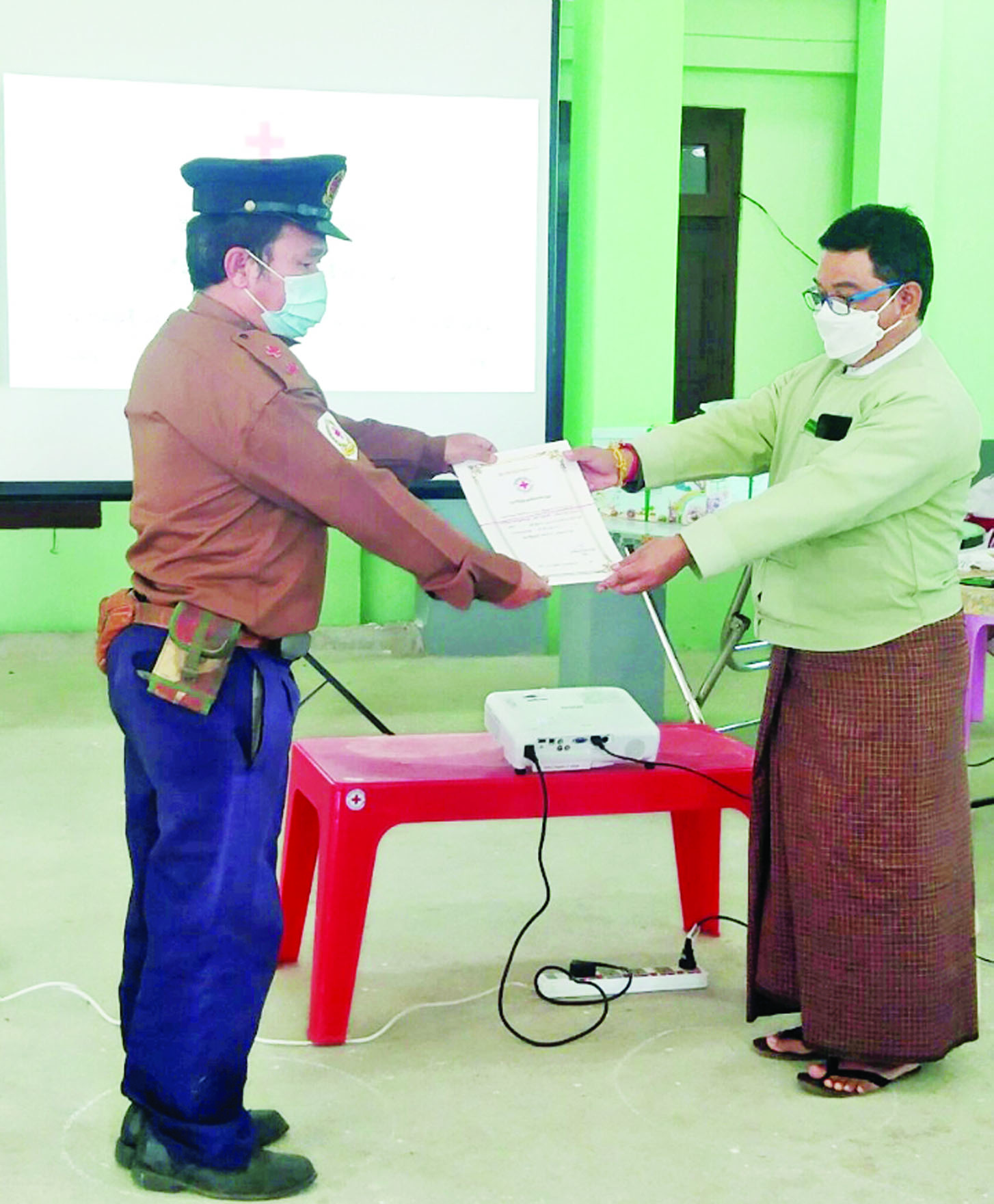 ထို့နောက် မြို့နယ်အုပ်ချုပ် ရေးမှူး၊ အသင်း ဥက္ကဋ္ဌ၊ ရှမ်း/ မြောက် တာဝန်ခံတို့က ကိုဗစ်-၁၉ ရောဂါ ကာကွယ်ရေး လုပ်ငန်း များတွင် စွမ်းစွမ်းတမံ ပါဝင် ကူညီ ဆောင်ရွက်ခဲ့သည့် ကြက်ခြေနီ လူငယ် ၂၇ ဦး၊ မြို့နယ် ကြက်ခြေနီတပ်ဖွဲ့မှူး ဒေါ်နန်းခင်ညွန့်လူ၊ တပ်ခွဲမှူး ဦးစိုင်းထွန်းဝင်းနှင့် တပ်ဖွဲ့ဝင် များအား ဂုဏ်ပြုလွှာနှင့် အမှတ်တရ လက်ဆောင် ပစ္စည်းများ ပေးအပ်ခဲ့ကြောင်း သိရသည်။