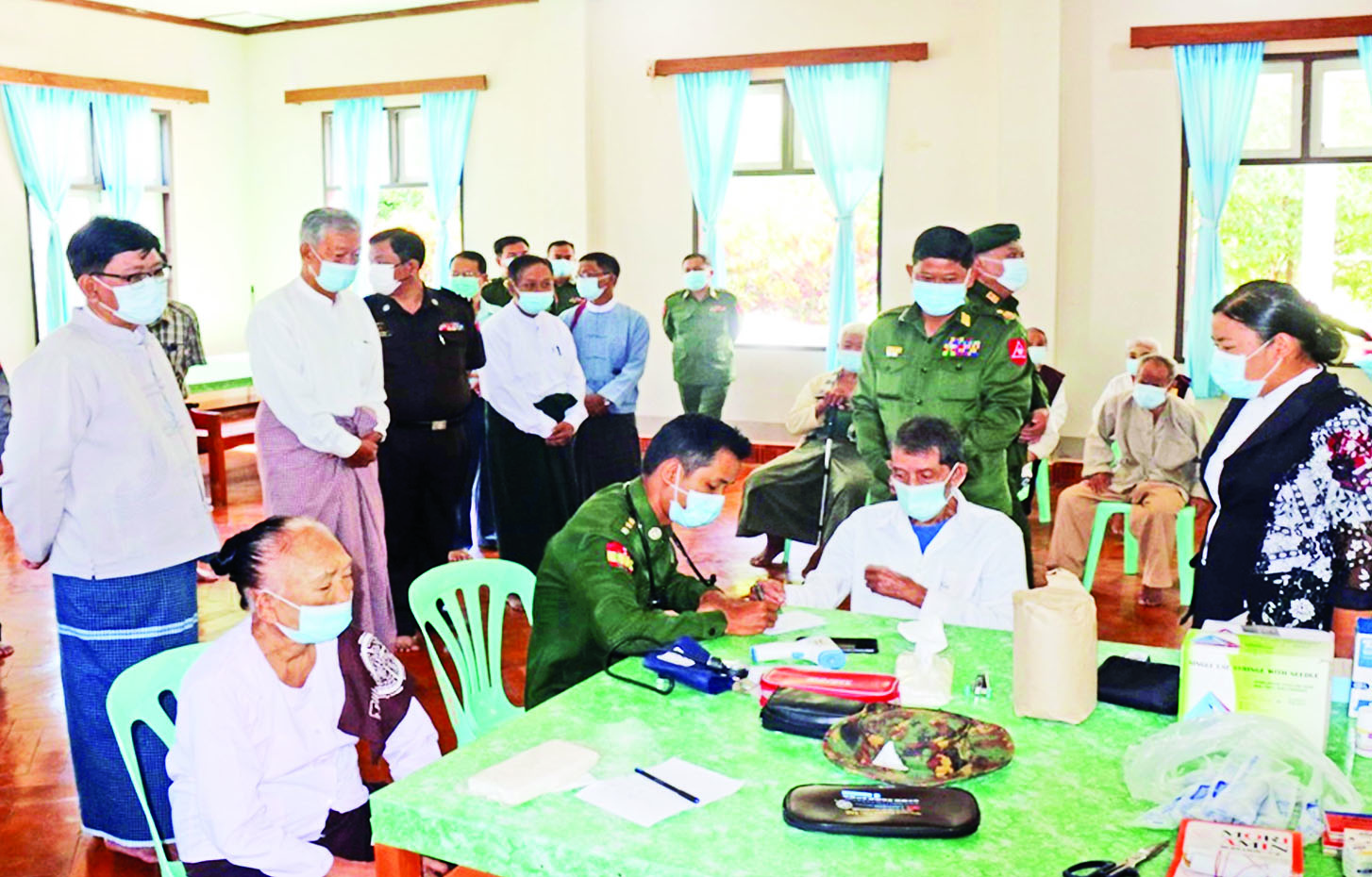 ထို့နောက် နယ်မြေခံဆေး တပ်ရင်းမှ ဆေးကုသရေးအဖွဲ့က ဒေသခံ တိုင်းရင်းသားပြည်သူများ အား ကျန်းမာရေးစောင့်ရှောက်မှု လုပ်ငန်းများ ဆောင်ရွက်ပေးသည်။ ထိုသို့ ဆောင်ရွက်ပေးနေမှုများကို တိုင်းမှူးနှင့် တာဝန်ရှိသူများက လိုက်လံကြည့်ရှု အားပေးကြပြီး ဆေးရုံတက်ရောက်ရန် လိုအပ်သူ များအား နယ်မြေခံတပ်မတော် ဆေးရုံသို့ တက်ရောက်ကုသနိုင် ရေး စီစဉ်ဆောင်ရွက်ပေးသည်။