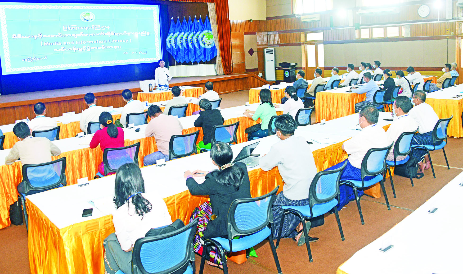 ပြန်ကြားရေး ဝန်ကြီးဌာနက ကြီးမှူးဖွင့်လှစ်သည့် မီဒီယာနှင့် သတင်းအချက်အလက် ဆိုင်ရာ သိနားလည်မှု (Media and Infor-mation Literacy) သင်တန်းဖွင့်ပွဲ အခမ်းအနားကို ယနေ့နံနက် ၉ နာရီခွဲတွင် နေပြည်တော်ရှိ ပြန်ကြားရေးဝန်ကြီးဌာန အစည်း အဝေးခန်းမ၌ ကျင်းပရာ အခမ်း အနားသို့ ဒုတိယဝန်ကြီး ဦးရဲတင့်၊ အမြဲတမ်းအတွင်းဝန် ဦးမျိုးမြင့် မောင်၊ ညွှန်ကြားရေးမှူးချုပ်များ နှင့် ဌာနဆိုင်ရာတာဝန်ရှိသူများ၊ သင်တန်းနည်းပြများ၊ ဝန်ကြီးဌာန အသီးသီးမှ သင်တန်းသား၊ သင်တန်းသူများ တက်ရောက်ကြ သည်။