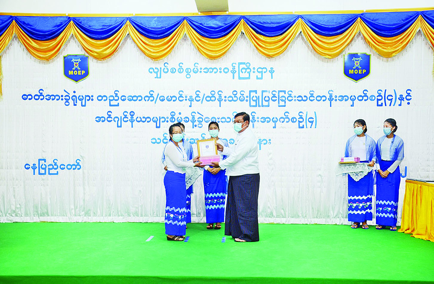 ထို့နောက် ပြည်ထောင်စုဝန်ကြီးက ဓာတ်အားခွဲရုံ များ တည်ဆောက်/ မောင်းနှင်/ ထိန်းသိမ်းပြုပြင်ခြင်း သင်တန်းမှ ထူးချွန်ဆုရရှိသူများကိုလည်းကောင်း၊ ဒုတိယဝန်ကြီး ဒေါက်တာအောင်ဇေယျက အင်ဂျင် နီယာများ စီမံခန့်ခွဲရေးသင်တန်းမှ ထူးချွန်ဆုရရှိသူ များကိုလည်းကောင်း ဆုများ ပေးအပ်ချီးမြှင့်ပြီး ညွှန်ကြားရေးမှူးချုပ်နှင့် ဦးဆောင်ညွှန်ကြားရေးမှူး တို့က သင်တန်းဆင်းလက်မှတ်များကို သင်တန်းသား များထံ ပေးအပ်ခဲ့ကြောင်း သိရသည်။