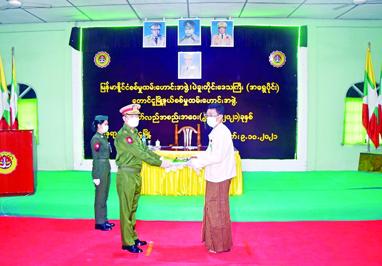 ဦးစွာ တိုင်းမှူးများက အမှာ စကားပြောကြားပြီး စစ်မှုထမ်း ဟောင်း အဖွဲ့ဝင်များအတွက် စားသောက်ဖွယ်ရာများနှင့် ကိုဗစ်- ၁၉ ရောဂါကာကွယ်ရေး အထောက် အကူပြုပစ္စည်းများကိုပေးအပ်ရာ တာဝန်ရှိသူများက လက်ခံယူကြသည်။
