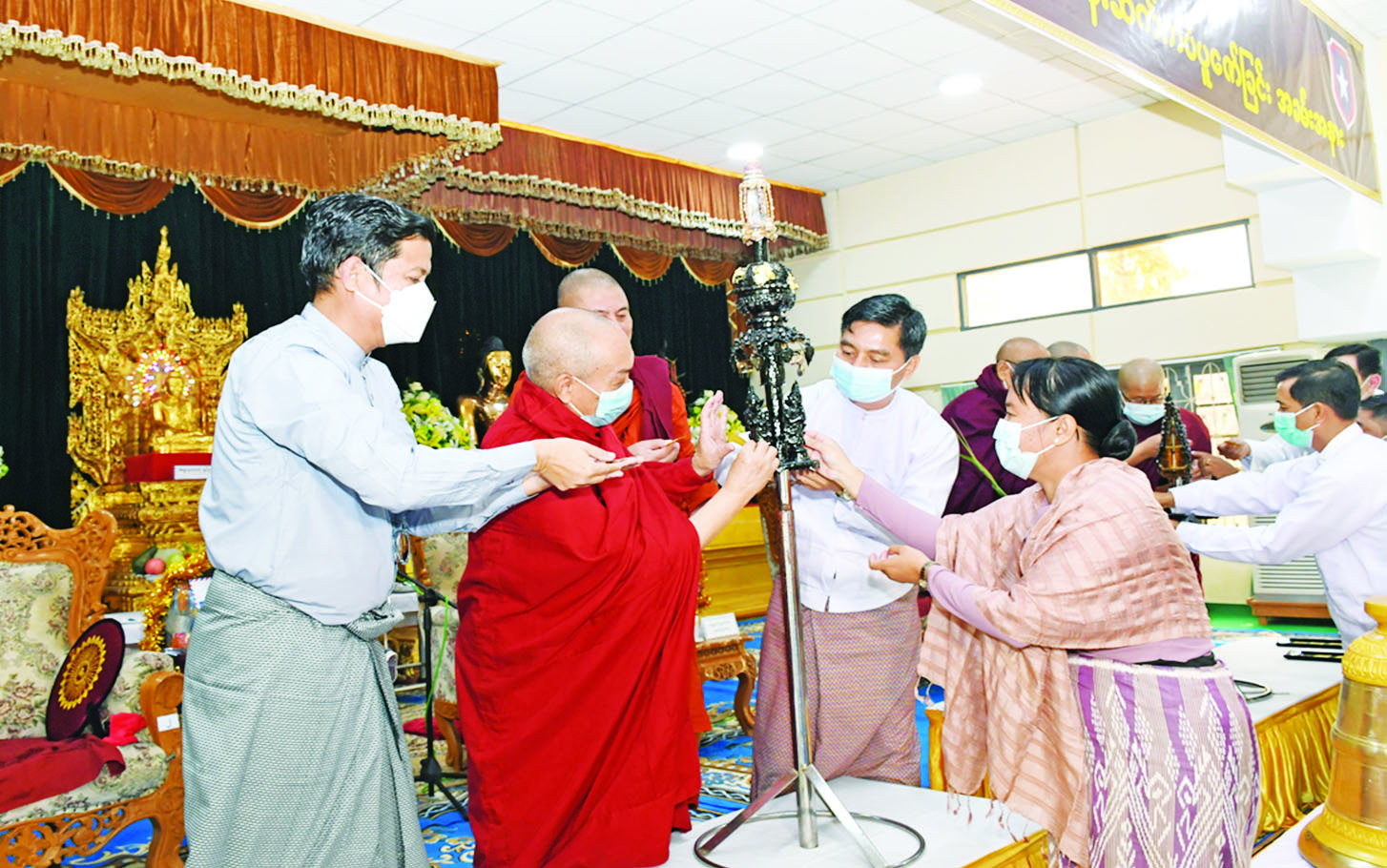 ဦးစွာ တိုင်းမှူးနှင့် တက်ရောက် လာကြသူများက  မဟာအောင်မြေ မြို့နယ်  မစိုးရိမ်တိုက်သစ်  မဟာ နာယက   ဆရာတော် နိုင်ငံတော် ဗဟိုသံဃာ့ဝန်ဆောင်  အဂ္ဂမဟာ ပဏ္ဍိတအဂ္ဂမဟာသဒ္ဓမ္မဇောတိက ဓဇ  ဘဒ္ဒန္တဝါသေဌာဘိဝံသထံမှ ငါးပါးသီလ    ခံယူဆောက်တည်ကြ ပြီး သံဃာတော်များက   ပရိတ် တရားတော်များ       ရွတ်ဖတ်ချီးမြှင့် ကြသည်။