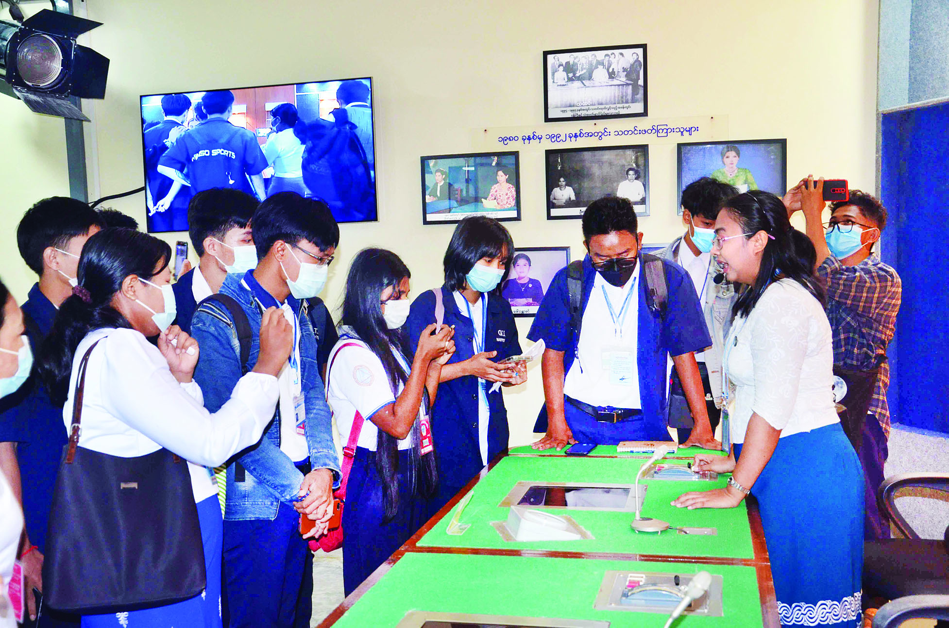 ပြန်ကြားရေးဝန်ကြီးဌာနမှ ဖွင့်လှစ် သည့် မှတ်တမ်းဗီဒီယို ရိုက်ကူး တည်းဖြတ်ခြင်းနှင့် သတင်း ရေးသားခြင်းဆိုင်ရာ အမှတ်စဉ်(၁) မှ သင်တန်းသား သင်တန်းသူများ နှင့် နေပြည်တော်ရှိ အစိုးရနည်း ပညာကောလိပ် AGTI သင်တန်း တွင် တက်ရောက်ပညာသင်ကြား လျက်ရှိကြသည့် လျှပ်စစ် ဆက်သွယ်ရေး အင်ဂျင်နီယာနှင့် သုတနည်းပညာ အင်ဂျင်နီယာ ကျောင်းသား ကျောင်းသူများ သည် ယနေ့နံနက်ပိုင်းတွင် နေပြည်တော် (တပ်ကုန်း) ရှိ မြန်မာ့ အသံနှင့် ရုပ်မြင်သံကြားသို့ ကြည့်ရှုလေ့လာကြသည်။
