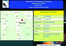 မေ ၁ ရက် ည ၉ နာရီ ၄၅ မိနစ်၊ ၃၈ စက္ကန့်အချိန်တွင် ဟားခါး မြေငလျင်စခန်းမှ အရှေ့-အရှေ့မြောက်ဘက် မိုင် ၄၀ ခန့်အကွာ၊ မြန်မာနိုင်ငံပြည်တွင်း (…