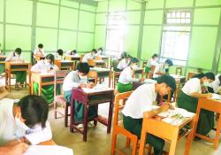 မတ် ၃၁ ရက်က ရန်ကုန်တိုင်းဒေသကြီး ဗဟန်းမြို့နယ် အမှတ်(၁) အခြေခံပညာအထက်တန်းကျောင်း၌ ကျောင်းသား ကျောင်းသူများ ၂၀၂၁ - ၂၀၂၂ ပညာသင်နှစ် တက္ကသိုလ်ဝင်စာမေးပွဲ မြန်မာစာဘာသာဖြေဆိုနေစဉ်။