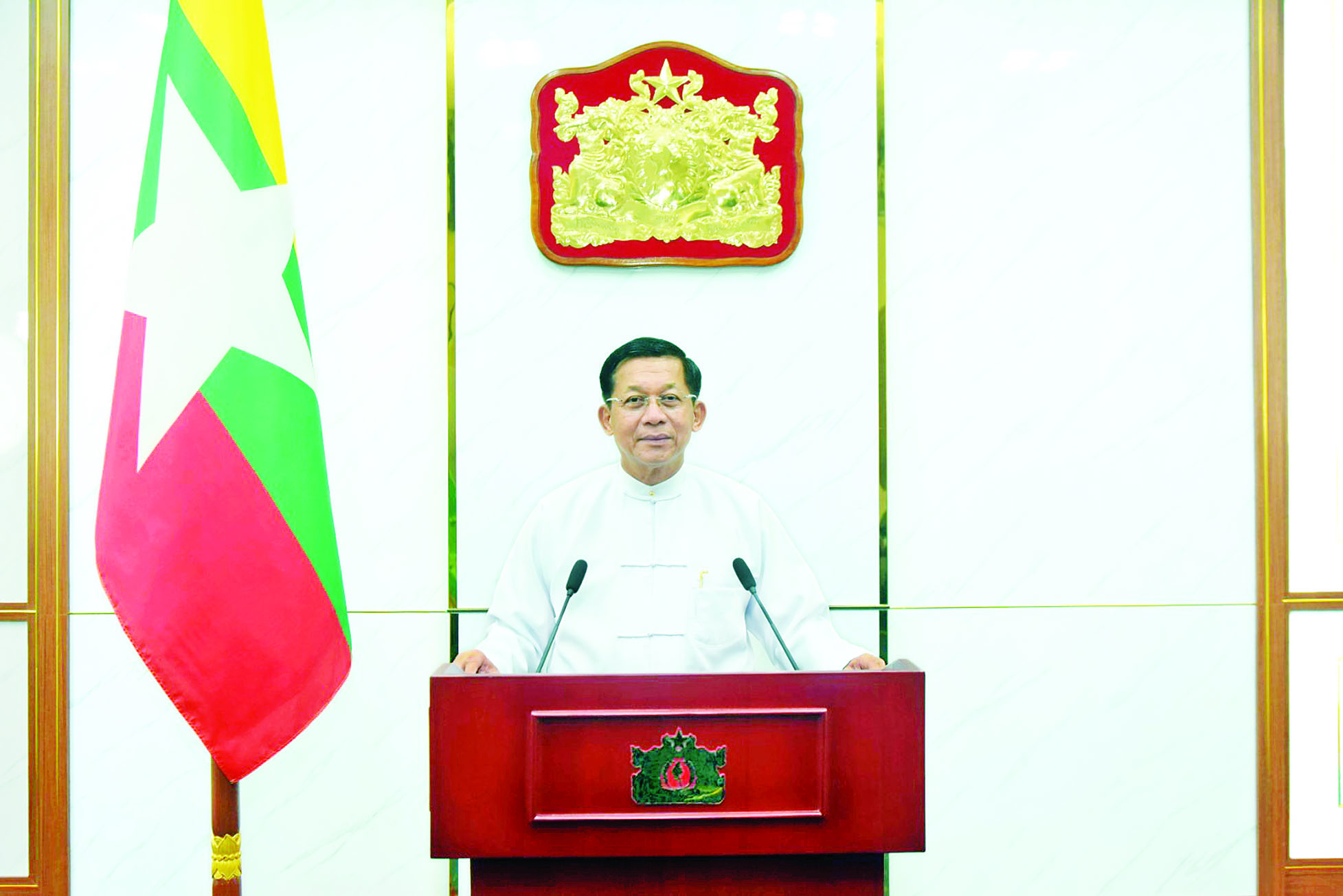 ကျွန်တော်တို့နိုင်ငံမှာ ဆေးရုံ ၁,၀၇၇ ခု၊ ဆေးပေးခန်း ၁၁,၄၂၇ခု ရှိပြီး ဆေးရုံ ၇၆၅ ရုံ၊ ဆေးပေးခန်း ၇,၄၃၀ ခု လုပ်ငန်းဆောင်ရွက်နိုင် မှုရှိပါတယ်။ တစ်နိုင်ငံလုံး ခန့်အပ်ဆရာဝန် ၁၄,၆၇၈ ဦး၊ ကျန်းမာရေး ဝန်ထမ်း ၁၀၅,၈၃၄ ဦးရှိပြီး အဲဒီအထဲမှ အချို့ဆရာဝန်နဲ့ ကျန်းမာရေး ဝန်ထမ်းများဟာ နိုင်ငံရေးဝါဒမှိုင်းတွေကြောင့် ပြည်သူများရဲ့အသက်နဲ့ ကျန်းမာရေးကို မငဲ့ကွက်ဘဲ မိမိတို့ရဲ့လုပ်ငန်းခွင်ကို စွန့်ခွာသွားခဲ့ကြ ပါတယ်။ ဒါ့ကြောင့် ကိုဗစ်-၁၉ ကာလမှာ ကျန်းမာရေးဝန်ထမ်းတွေဟာ သူတို့ရဲ့လူနာရှင်တွေကို မပစ်ခွာဘဲ တာဝန်သိသိ သစ္စာရှိရှိ တာဝန် ထမ်းဆောင်ခဲ့လို့ ကျွန်တော်တို့အစိုးရအနေနဲ့ အသိအမှတ်ပြု ပါတယ်။ ဆေးရုံအသီးသီးမှာ လိုအပ်တဲ့ ကျန်းမာရေးဝန်ထမ်းများ နေရာများမှာ တပ်မတော်သားဆေးတပ်ဖွဲ့ဝင်များက ဝင်ရောက်ကူညီ ဆောင်ရွက်ပေးတာနဲ့ တပ်မတော်ဆေးရုံအသီးသီးမှာ ပြည်သူများ ဆေးကုသပေးနိုင်အောင် ဆောင်ရွက်ပေးခဲ့ပါတယ်။ အငြိမ်းစားကျန်းမာရေးဝန်ထမ်းများနဲ့ အငြိမ်းစားတပ်မတော်ဆေးတပ်ဖွဲ့ဝင်များလည်း ဝင်ရောက်အားဖြည့် ကူညီပေးခဲ့ကြပါတယ်။ ကိုဗစ်-၁၉ ကာလအတွင်း ကျန်းမာရေး ဝန်ထမ်းတွေအပေါ် တာဝန်ထမ်းဆောင်မှု အသိအမှတ်ပြုတဲ့အနေနဲ့ အစိုးရအနေဖြင့် ၁၀,၉၄၄,၅၄၅,၀၀၀ ကျပ် (၁၀ ဒသမ ၉၄ ဘီလီယံ)အား ဆုချီးမြှင့်ခဲ့ပါတယ်။