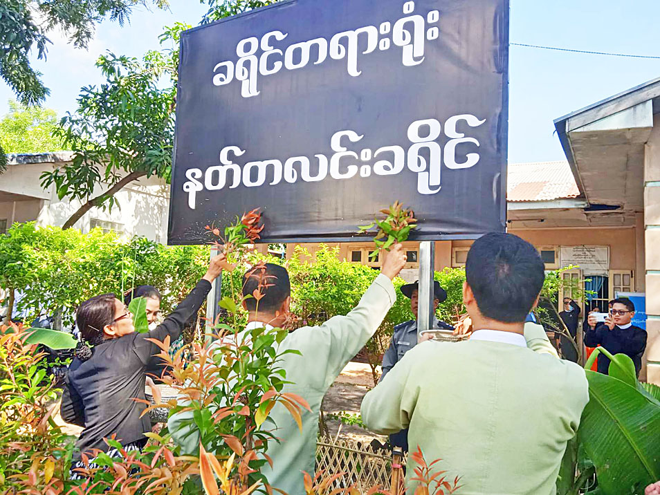 ရှေးဦးစွာ နတ်တလင်းခရိုင်တရားသူကြီး ဒေါ်စန်းသိင်္ဂီက အမှာ စကားပြောကြားပြီး နတ်တလင်းခရိုင်စီမံအုပ်ချုပ်ရေးအဖွဲ့ဥက္ကဋ္ဌ ဦးခင် မောင်ဦး၊ သာယာဝတီခရိုင် တရားသူကြီး ဒေါ်မေစိမ့်စမ်း၊ နတ်တလင်း ခရိုင်တရားသူကြီး ဒေါ်စန်းသိင်္ဂီ၊ နတ်တလင်းမြို့နယ်စီမံအုပ်ချုပ်ရေးအဖွဲ့ဥက္ကဋ္ဌ ဦးကျော်ကျော်ဦးတို့ကခရိုင်တရားရုံး ဆိုင်းဘုတ်ကို စိုက်ထူ ပေးခဲ့ပြီး အဆိုပါဆိုင်းဘုတ်အား အမွှေးနံ့သာရည်များ ပက်ဖျန်းကာ ဖွင့်လှစ်ပေးခဲ့သည်။
