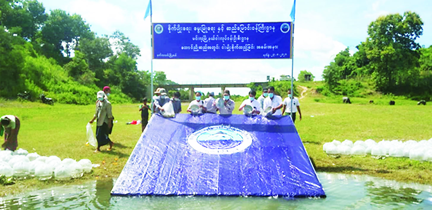 ပဲခူးတိုင်းဒေသကြီး မင်းလှမြို့နယ် ငါးလုပ်ငန်းဦးစီးဌာနမှ ဆည်တမံ ကန်များအတွင်း ငါးသယံဇာတ ပေါကြွယ်ဝစေရေး၊ ငါးရိက္ခာဖူလုံ စေရေးနှင့် ဒေသတွင်းရေလုပ်သား များ အလုပ်အကိုင်ဖွံ့ဖြိုးတိုးတက် စေရန် ရည်ရွယ်၍ နတ္တလင်း မြို့နယ် တောင်ညိုဆည်အတွင်းသို့ အုတ်ဖိုငါးလုပ်ငန်းစခန်းမှ သား ဖောက်ထုတ်လုပ်သော ၂ လက်မ အရွယ် ငါးမြစ်ချင်းသားပေါက် ကောင်ရေ ၆၀၀၀၀ နှင့် ငါးခုံးမ ကြီးသားပေါက်ကောင်ရေ၆၀၀၀၀ စုစုပေါင်း ငါးသားပေါက်ကောင်ရေ ၁၂၀၀၀၀ အား မျိုးစိုက်ထည့်ခဲ့ သည်။ (ယာပုံ)