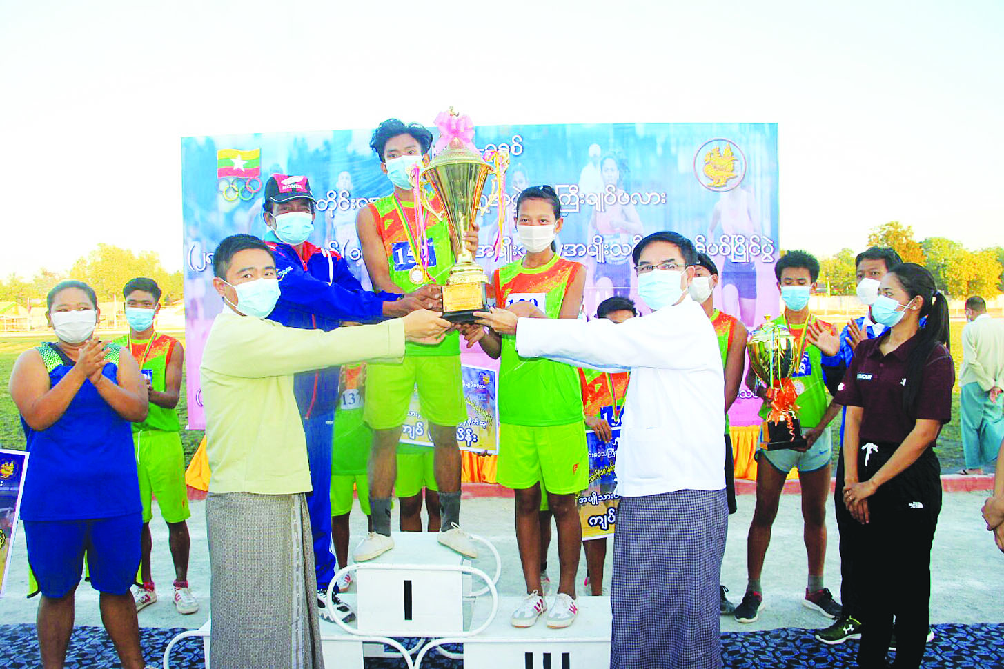 ပဲခူးတိုင်းဒေသကြီးဝန်ကြီးချုပ် ဖလား ၂၈ မြို့နယ် အသက် ၁၈ နှစ်အောက် အမျိုးသား အမျိုး သမီး ပြေးခုန်ပစ်ပြိုင်ပွဲ ဗိုလ်လုပွဲ နှင့် ဆုချီးမြှင့်ပွဲကို ပဲခူးမြို့ ဥဿာမြို့သစ် အားကစားကွင်း၌ ဒီဇင်ဘာ ၂၉ ရက်က ကျင်းပရာ တိုင်းဒေသကြီးဝန်ကြီးချုပ် ဦးမျိုး ဆွေဝင်းနှင့် တိုင်းဒေသကြီး ဝန်ကြီးများ၊ ဌာနဆိုင်ရာများက ကြည့်ရှု အားပေးကြသည်။