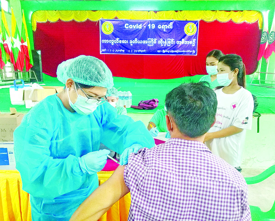 ဒုတိယအကြိမ် ကိုဗစ်ရောဂါ ကာကွယ်ဆေး ဆက်လက်ထိုးနှံ ပေးခြင်းကို မြို့နယ်စီမံအုပ်ချုပ် ရေးအဖွဲ့ဥက္ကဋ္ဌ ဦးကျော်ဝင်းနှင့် အဖွဲ့ဝင်များ လာရောက်ကြည့်ရှု ကြသည်။ ဒုတိယအကြိမ် ကိုဗစ်-၁၉ ရောဂါ ကာကွယ်ဆေးထိုးနှံ ပေးခြင်း ဆောင်ရွက်ရာတွင် ဌာန အသီးသီးမှ ဝန်ထမ်းများ၊ မြို့နယ် ကြက်ခြေနီ အဖွဲ့ဝင်များနှင့် စေတနာ့ဝန်ထမ်းများက လိုအပ် သည်များကို ဆောင်ရွက်ပေး သည်။
