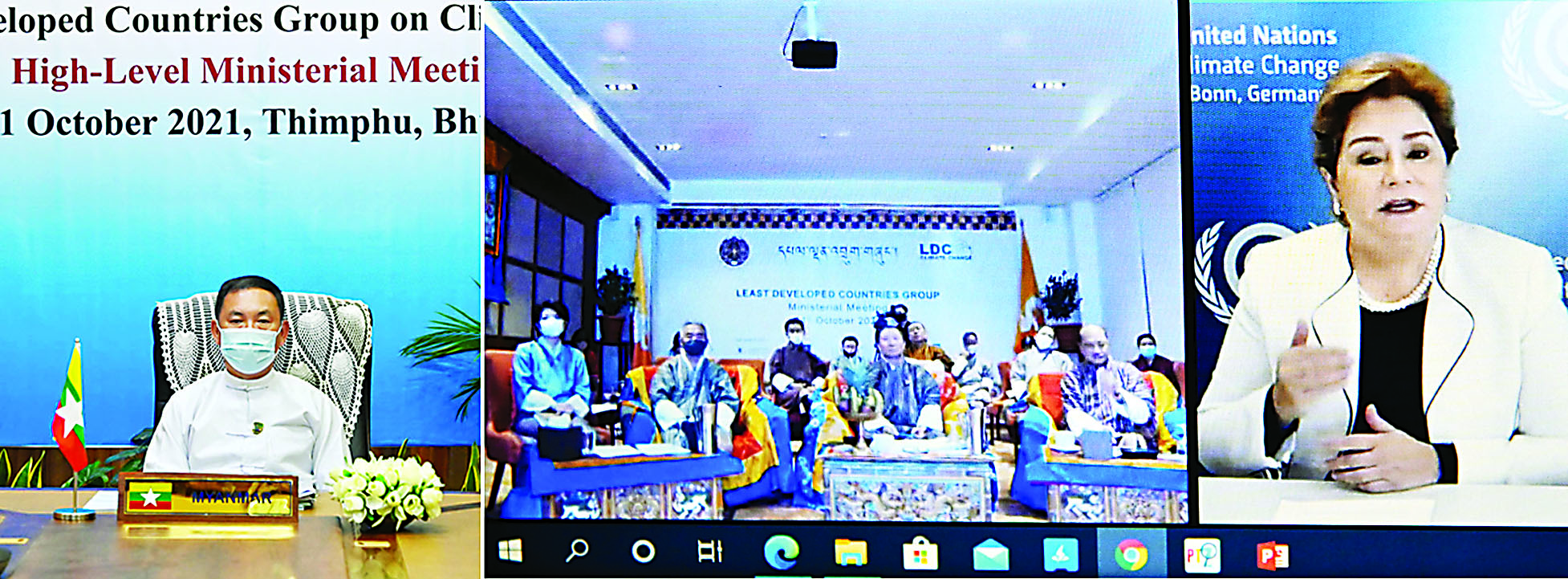 ယင်းအစည်းအဝေးတွင် ပြည်ထောင်စုဝန်ကြီးက ကိုဗစ်-၁၉ ရောဂါဖြစ်ပွားနေမှုနှင့်အတူ ရာသီဥတု ပြောင်းလဲမှုသည် လူမှုစီးပွားဖွံ့ဖြိုးမှုနှင့် ရှင်သန်မှု အပေါ် အဓိကခြိမ်းခြောက်နေသဖြင့် ဖွံ့ဖြိုးမှုအနည်း ဆုံးနိုင်ငံများအုပ်စုအနေဖြင့် ရာသီဥတုပြောင်းလဲမှု တိုက်ဖျက်ရေးတွင် ပူးပေါင်းဆောင်ရွက်ရန် အလွန် အရေးကြီးပါကြောင်း၊ မြန်မာနိုင်ငံအနေဖြင့် စိုက်ပျိုး ရေး၊ သစ်တောနှင့် မြေအသုံးချမှုကဏ္ဍ၊ ပြန်ပြည့်မြဲနှင့်  စွမ်းအင်ချွေတာရေးကဏ္ဍများအတွက် ရည်မှန်းချက် များပါဝင်သည့် မြန်မာနိုင်ငံ ရာသီဥတုပြောင်းလဲမှု လျှော့ချရေးနှင့် လိုက်လျောညီထွေရှိစေရေးဆိုင်ရာ လုပ်ငန်းအစီအစဉ် (NDC) ကို (UNFCCC) အတွင်း ရေးမှူးရုံးသို့  တင်သွင်းပြီးဖြစ်ကြောင်း၊   ရာသီဥတု ပြောင်းလဲမှုကြောင့်   ထိခိုက်အလွယ်ဆုံး   နိုင်ငံ တစ်နိုင်ငံဖြစ်သည့်အတွက် ရာသီဥတုဒဏ်ခံနိုင်ရည် ရှိစေရေးနှင့် လိုက်လျောညီ​ထွေရှိစေရေးလုပ်ငန်း များသည် နိုင်ငံ၏ ဦးစားပေးလုပ်ငန်းများ  ဖြစ်ပါ ကြောင်း၊   ၂၀၂၀ ပြည့်နှစ်မှစ၍   ရာသီဥတုဆိုင်ရာ လုပ်ငန်းများ   အကောင်အထည်ဖော်ရန်   ဖွံ့ဖြိုးပြီး နိုင်ငံများမှ နှစ်စဉ် အမေရိကန်ဒေါ်လာ ဘီလီယံ ၁၀၀ ကို ကတိကဝတ်အတိုင်း ထည့်ဝင်စေရေး၊  ရာသီဥတု ပြောင်းလဲမှုကြောင့်   ပျက်စီးဆုံးရှုံးမှုများအတွက် အထောက်အပံ့ရရှိရေး၊ ဆင်းရဲမှုလျှော့ချရေး၊ အမျိုး သားအဆင့် လိုက်လျောညီထွေရှိစေခြင်းအစီအစဉ် အကောင်အထည်ဖော်ရေး၊ ရေရှည်ရန်ပုံငွေအထောက် အပံ့မြှင့်တင်ရေးတို့ကို     အလေးပေးဆောင်ရွက်ရန် လိုပါကြောင်း၊ ဖွံ့ဖြိုးမှုအနည်းဆုံးနိုင်ငံများအုပ်စု၏ ရပ်တည်ချက်များကို ထင်ဟပ်သည့် သင်ဖူး ရည်မှန်း ချက်နှင့် လုပ်ဆောင်ချက်ဆိုင်ရာ အဆိုပြုကြေညာ ချက် (Thimphu Call for Ambition and Action) ကို အပြည့်အဝထောက်ခံပါကြောင်း၊ ယနေ့အစည်း အဝေးမှ (COP 26) တွင် ဖွံ့ဖြိုးမှု အနည်းဆုံးနိုင်ငံများ အုပ်စု၏ အဓိကရပ်တည်ချက်များကို ခိုင်မာစွာပြသ နိုင်ရန် စေ့စပ်ညှိနှိုင်းရေး ရလဒ်ကောင်းများ ရရှိနိုင် မည်ဟု   မျှော်လင့်ပါကြောင်း  ဆွေးနွေးပြောကြား သည်။