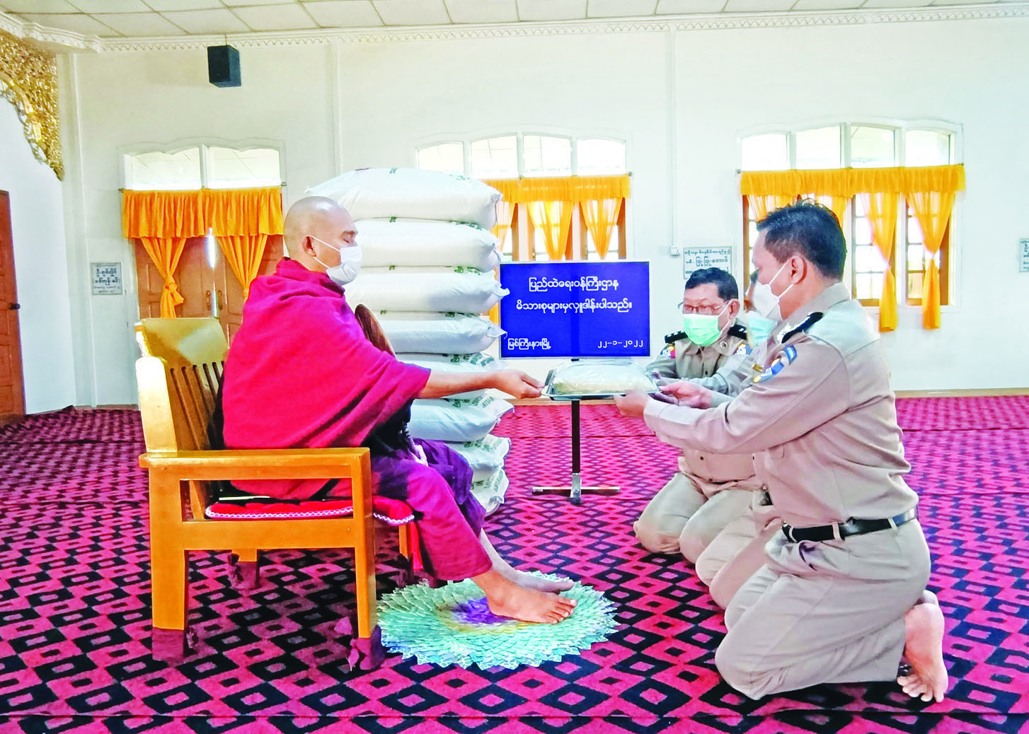 ကိုဗစ်- ၁၉ ရောဂါ ကြိုတင် ကာကွယ်ရေးလုပ်ငန်းများ ဆောင် ရွက်နေသည့် ကာလအတွင်း ဆွမ်း ကိစ္စရပ်များ အဆင်ပြေစေရန် ရည်ရွယ်၍ ပြည်ထဲရေးဝန်ကြီး ဌာန၊ တပ်ဖွဲ့ဝင်/ဝန်ထမ်း အရာ ထမ်း၊ အမှုထမ်းမိသားစုများက မြို့နယ်အသီးသီးရှိ ဘုန်းတော်ကြီး ကျောင်းများသို့ ဆွမ်းဆန်တော် များ ဆက်ကပ်လှူဒါန်းခြင်းကို ဆောင်ရွက်လျက်ရှိသည်။