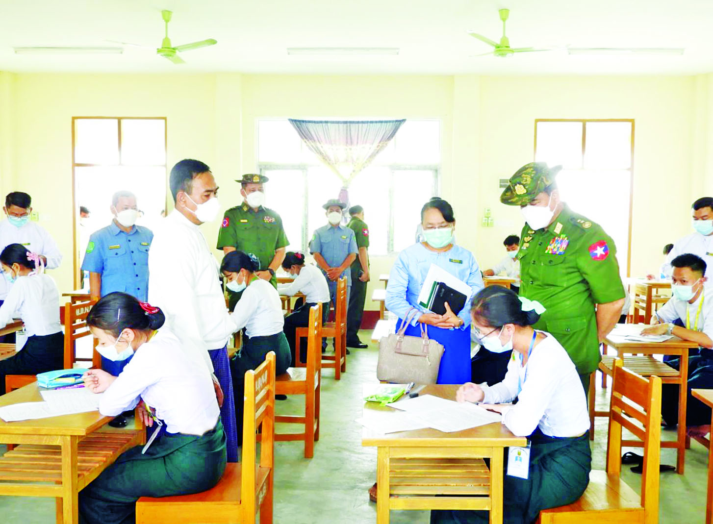 နယ်စပ်ရေးရာဝန်ကြီးဌာန ပြည်ထောင်စုဝန်ကြီး ဒုတိယဗိုလ်ချုပ်ကြီး ထွန်းထွန်းနောင်သည် စစ်ကိုင်း တိုင်းဒေသကြီး လုံခြုံရေးနှင့်နယ်စပ်ရေးရာဝန်ကြီး ဗိုလ်မှူးကြီး ဝင်းတင်စိုးနှင့်အတူ ယမန်နေ့ နံနက်ပိုင်းတွင် စစ်ကိုင်းတိုင်းဒေသကြီး ရွာသစ်ကြီး ကျေးရွာရှိ ပြည်ထောင်စုတိုင်းရင်းသားလူမျိုးများ ဖွံ့ဖြိုးရေးတက္ကသိုလ်သို့ ရောက်ရှိခဲ့ပြီး ဖွံ့ဖြိုးရေး တက္ကသိုလ်၌ ၂၀၁၉-၂၀၂၀ ပညာသင်နှစ် ပညာရေး ဘွဲ့ ငါးနှစ်သင်တန်း၊ အမှတ်စဉ်(၅) စတုတ္ထနှစ် (ဒုတိယနှစ်ဝက်) သင်တန်းတက်ရောက်နေသည့် သင်တန်းသား သင်တန်းသူများ၏ ကိုဗစ်-၁၉ စည်းကမ်းချက်များနှင့်အညီ စာမေးပွဲဖြေဆိုနေမှုကို ကြည့်ရှုအားပေးသည်။