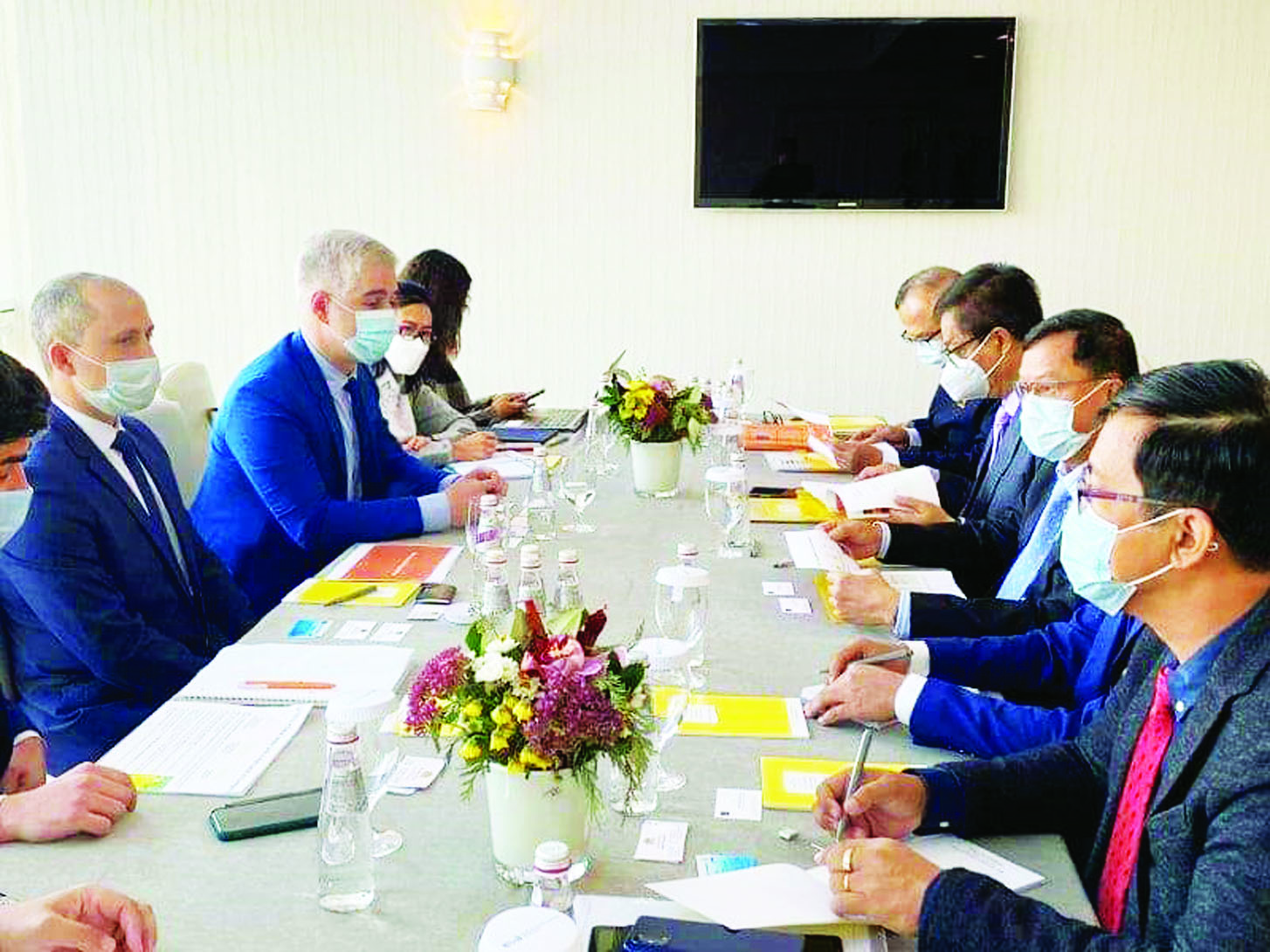 ရုရှားဖက်ဒရေးရှင်းနိုင်ငံ၌ ကျင်းပပြုလုပ်သော Russian Energy Week International Forum (REW 2021)သို့ တက်ရောက်ရန် မော်စကိုမြို့၌ ရောက်ရှိနေသည့် လျှပ်စစ်နှင့် စွမ်းအင်ဝန်ကြီးဌာန ပြည်ထောင်စုဝန်ကြီး ဦးအောင်သန်းဦးနှင့်အဖွဲ့သည် အောက်တိုဘာ ၁၂ ရက်တွင် ရုရှားနိုင်ငံရှိ လျှပ်စစ်နှင့်စွမ်းအင်ကဏ္ဍဆိုင်ရာ ကုမ္ပဏီနှင့် အသင်းအဖွဲ့များမှ တာဝန်ရှိသူများနှင့် နှစ်နိုင်ငံရင်းနှီးမြှုပ်နှံမှုဆိုင်ရာ ကိစ္စရပ်များနှင့် ပတ်သက်၍ တွေ့ဆုံဆွေးနွေးသည်။