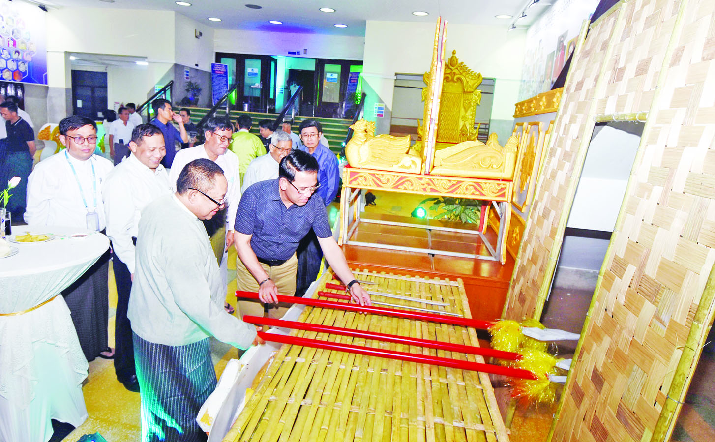 ရှေးဦးစွာ    ပြည်ထောင်စု ဝန်ကြီး   ဦးမောင်မောင်အုန်းနှင့် မြန်မာနိုင်ငံ  ရုပ်ရှင်အစည်းအရုံး ဥက္ကဋ္ဌ      ဦးကြည်စိုးထွန်း၊ ရုပ်ရှင်၊ သဘင်၊ ဂီတတို့မှ ပညာရှင် များ၊     အနုပညာရှင်များနှင့် ဖိတ်ကြားထားသော   ဧည့်သည် တော်များက  (၃၈)ဖြာ  မင်္ဂလာ အစီအစဉ်          ရိုက်ကူးရာတွင် အသုံးပြုသည့် ဆက်တင်ပစ္စည်း များ နှင့် ရုပ်ရှင်၊ သဘင်၊ ဂီတတို့မှ          ပညာရှင်များ၏   ရုပ်ပုံလွှာများ    ပြသထားမှုကို  ကြည့်ရှုအားပေးသည်။