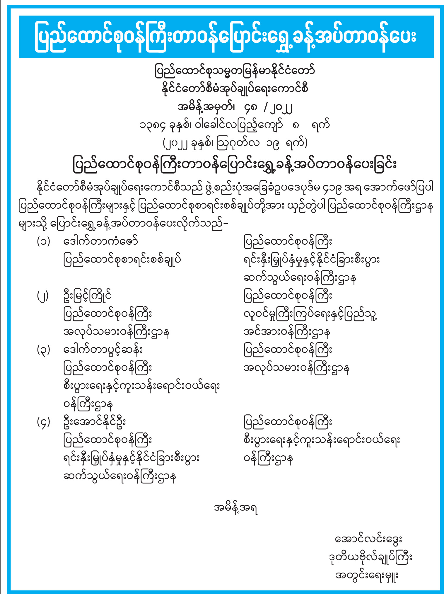 နိုင်ငံတော်စီမံအုပ်ချုပ်ရေးကောင်စီသည် ဖွဲ့စည်းပုံအခြေခံဥပဒေပုဒ်မ ၄၁၉ အရ အောက်ဖော်ပြပါ ပြည်ထောင်စုဝန်ကြီးများနှင့် ပြည်ထောင်စုစာရင်းစစ်ချုပ်တို့အား ယှဉ်တွဲပါ ပြည်ထောင်စုဝန်ကြီးဌာန များသို့ ပြောင်းရွှေ့ခန့်အပ်တာဝန်ပေးလိုက်သည်-
