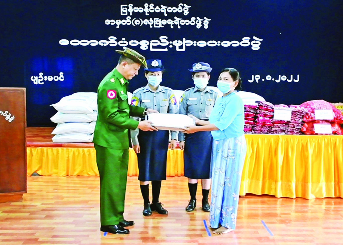 ရန်ကုန်တိုင်းဒေသကြီး  အတွင်း  လုံခြုံရေးတာဝန် ထမ်းဆောင်နေ သော   မြန်မာနိုင်ငံ   ရဲတပ်ဖွဲ့ဝင် များကို   ဆန်နှင့်   စားသောက် ဖွယ်ရာများ       ပေးအပ်ခြင်းကို ယနေ့နံနက်ပိုင်းတွင်     မင်္ဂလာဒုံ မြို့နယ်ရှိ နယ်မြေခံရဲတပ်ဖွဲ့ခွဲရုံး၌ ပြုလုပ်ရာ တိုင်းဒေသကြီး ဝန်ကြီး ချုပ်    ဦးစိုးသိန်း၊   ရန်ကုန်တိုင်း စစ်ဌာနချုပ်   တိုင်းမှူး   ဗိုလ်ချုပ် ညွန့်ဝင်းဆွေနှင့် တာဝန်ရှိသူများ၊  မြန်မာနိုင်ငံ   ရဲတပ်ဖွဲ့ဝင်များနှင့်  မိသားစုဝင်များ    တက်ရောက်ကြ သည်။